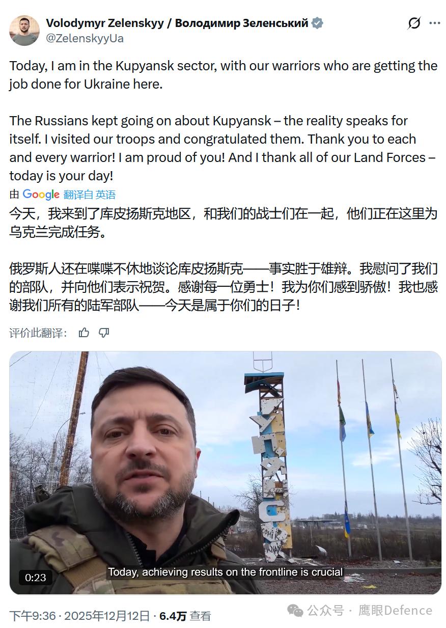 烽火问鼎计划 昨天,泽连斯基前往已被俄军宣布占领的库皮扬斯克视察,并在城市入口处发布讲话,我看到网上有很多信息,宣称泽连斯基当时距离俄军阵地很近,最多不到2000米,距离灰色区域更是只有几百米。来自俄罗斯的假消息 泽连斯基讲话的视频中,可以明显听到附近传来至少两次爆炸声,不得不感叹泽连斯基的英勇无畏,总是出现在战斗最激烈的地方,激励乌军前线将士和整个乌克兰,希望泽连斯基在这类行动中不要出事,毕竟,在无人机到处飞的前线,实在是太危险了。泽连斯基:“今天是库皮扬斯克方向,我们的士兵在这里为乌克兰取得成果。许多俄罗斯人谈论过库皮扬斯克——我们都看到了。我到了这里,我向战士们表示祝贺。感谢每一个部队、每一个在这里作战的人、每一个摧毁占领者的人。今天,在前线取得成果极其重要,这样乌克兰才能在外交上取得成果。就是这样:我们国家内部的所有强大阵地,都是结束战争谈判中的强大阵地。感谢每一位士兵!我为你们骄傲!感谢我们所有的地面部队——今天是你们专属的日子。谢谢你们,伙计们!”11月20日,俄军西部集团军司令谢尔盖·库佐夫列夫上将报告普京以占领库皮扬斯克,普京本人则在12月2日宣称已做好准备,要让外国记者前往波克罗夫斯克和库皮扬斯克的所有街区去看看实际情况,好在那些外国记者们没去,要不然,啧啧。12月9日,谢尔盖·库佐夫列夫上将被授予“俄罗斯英雄”称号,获得金星勋章;12月12日,乌克兰总统泽连斯基现身库皮扬斯克打脸,不知道会不会影响到谢尔盖·库佐夫列夫上将的仕途。