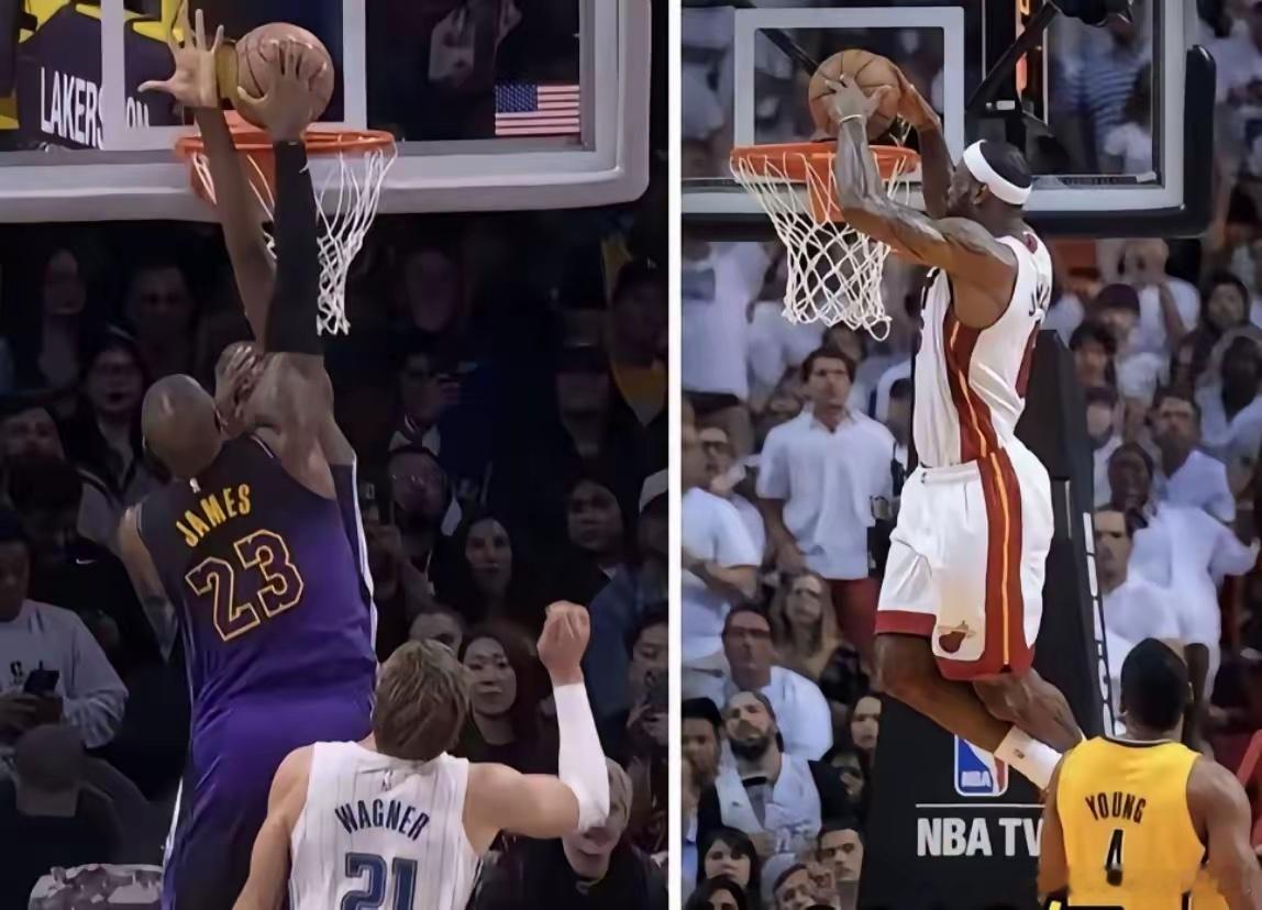 詹姆斯恐怕做梦也没想到,自己会因为常规赛的一次扣篮上了热搜。不懂球的人,只会惊呼扣篮的精彩。而经常看球的人,技术分析派,则会做各种分析比对。从这张图可以看出来,詹姆斯的弹跳力,衰减了八成不止。这记勉扣之所以能成功,也是荷尔蒙刺激加上运气不错。因为哪怕再低一厘米,这球也卡在篮脖子上了。就连解说员也说,这球还不如不扣呢。