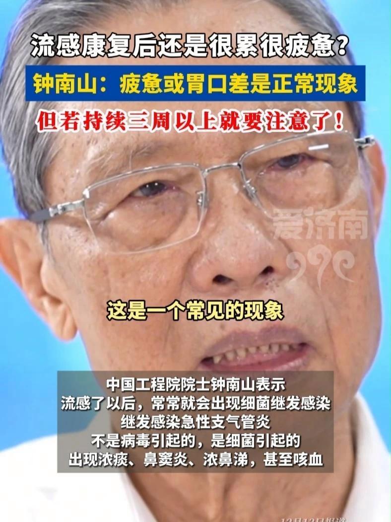 钟南山紧急提醒:流感出现这3种情况立刻就医!浙江女子硬扛3天肺变“白”的教训太惨痛 最近打开朋友圈,一半人在晒感冒,一半人在扛流感。中国疾控中心最新数据显示,门急诊流感病毒检出阳性率已达54.2%,流感正处于高流行水平。但很多人还把流感当“重感冒”硬扛,直到钟南山院士的紧急发声,才让无数人惊醒:流感绝非小事,出现三种情况必须立刻就医,别拿生命赌侥幸! 谁身边没有这样的“硬扛族”?觉得发烧咳嗽扛几天就好,吃点感冒药硬撑着上班上学。可浙江39岁的程女士,就是这样把轻症流感拖成了重症——高烧39.7℃硬扛3天,最后肺都出现了“白肺”血氧饱和度只剩88%,差点危及生命。这不是个例,每年流感季,都有人因忽视重症信号,引发肺炎、心肌炎等严重并发症,甚至付出生命代价。 钟南山院士明确划出的“就医红线”,每个家庭都该刻在心上:一是高烧39℃以上持续3天不退,或退烧后又反复发热;二是呼吸异常加快,成人超20次/分钟、儿童明显急促;三是剧烈咳嗽咳痰,甚至出现咳血、脓痰等继发感染迹象。要知道,流感和普通感冒天差地别:普通感冒多低烧、鼻塞流涕,一周自愈;而流感是病毒猛攻,全身酸痛、畏寒乏力症状更重,重症风险极高。 尤其要警惕老人、孩子、孕妇和慢性病患者,这些人群是流感重症高危群体。很多老人心疼子女,生病后瞒着不说;年轻人仗着身体好,硬扛成重症,最后反而让家人担心。其实早发现早治疗,在症状出现48小时内使用抗病毒药物就能大幅降低重症风险。这不是娇气,而是对自己和家人负责。 除了警惕重症信号,预防也同样重要。每年接种流感疫苗是最经济有效的方式即使错过最佳接种期,整个流行季都能补种。日常勤通风、戴口罩、勤洗手,少去人群密集的密闭空间,这些简单的习惯就能筑牢防护墙。 流感季的健康,从来不是靠“硬扛”得来的。钟南山院士的提醒,既是科学指导更是对每个人的守护。别等小病变大病才追悔莫及,转发给家人朋友,把就医红线记牢,把防护措施做好,才能平安度过这个流感季。 你身边有人正在扛流感吗?要不要我帮你整理一份流感预防+居家护理的详细指南,分享给需要的人?