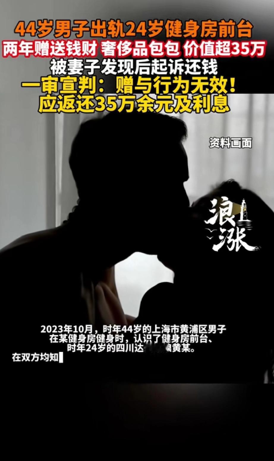 2023年10月44岁男子出轨24岁健身房前台,双方都知道王某已婚的情况下,还搞婚外情,王某两年内赠送“黄某”钱财 奢侈品包包 价值超过35万。 2025年初俩人的不正当关系被王某妻子魏某发现,魏某起诉要求黄某还钱。 一审宣判:赠与行为无效,黄某应返还35万余元及利息。 不得不说这个判决实在大快人心,不但返还本金,还要连利息一并返还。 一个图财一个图色,这大叔算是白嫖了,女前台赔了青春钱财也没得到,真是活该。 好好的年龄不去谈恋爱,非要找个已婚的大叔,在知道对方已婚的情况下,破坏别人的家庭。 这大叔为了爱情昏头了,自己已经有了家室,还去沾花拈草,不珍惜家庭,现在事发如何面对妻子和孩子。