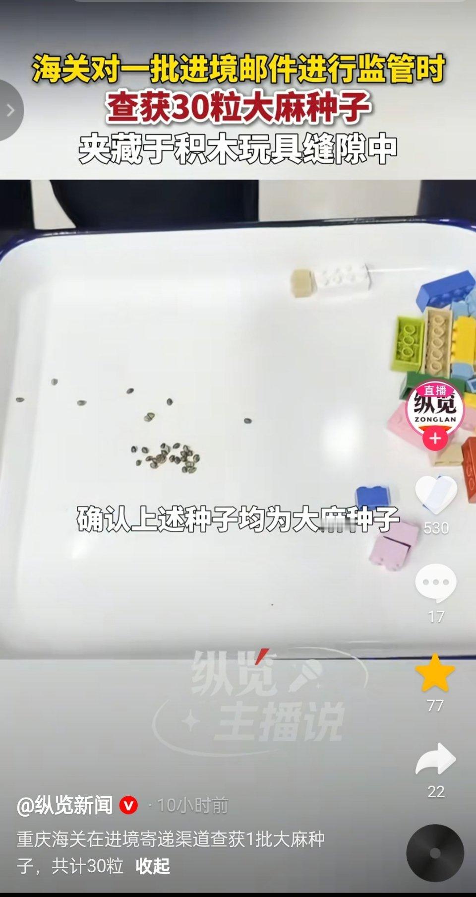 媒体:海关对一批进境邮件进行监管时,查获30粒大麻种子,夹藏于积木玩具缝隙中。热点现场