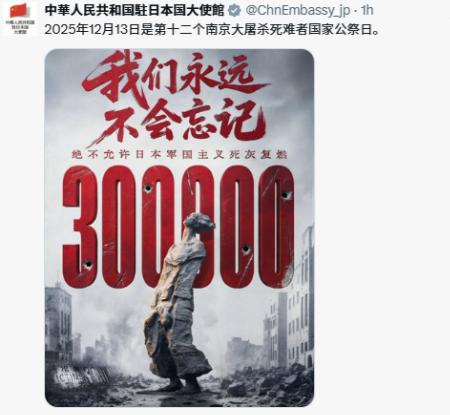 这次我们一个日本字都没写!中国驻日大使馆12月13日发文写道:2025年12月13日是第十二个南京大屠杀死难者国家公祭日,并附图,图中,巨大的红色“300000”字样让人醒目,一位衣衫褴褛、身形佝偻的受难者形象立在下面,当时的绝望和苦难是我们现代人无法想象的。 2025年12月13日,中国驻日大使馆的一条官方发文,在中日舆论场掀起了特殊的涟漪。 没有常见的外交辞令交锋,没有针对特定对象的直接表述,全文仅一句话点明“第十二个南京大屠杀死难者国家公祭日”的核心信息。 配图却成为穿透语言壁垒的关键载体,这种“留白式表达”的传播逻辑,值得深入拆解,这幅引发广泛讨论的图片,视觉设计极具叙事张力。 暗红色的“300000”字样占据画面主体,色调并非刺眼的鲜红,而是接近干涸血迹的沉郁,让数字脱离了单纯的统计符号属性,转化为承载集体创伤的视觉图腾。 下方的受难者形象没有夸张的痛苦表情,佝偻的脊背、紧绷的肩头和攥紧的枯手,通过肢体语言传递出的绝望,比直接的哭号更具情感穿透力。 这种“克制的苦难表达”,恰好避开了情感过载的传播陷阱,让不同文化背景的观者都能共情其背后的悲剧。 更值得关注的是“未提日本一字”的叙事策略,其传播效果远超直白的谴责。 在国际传播中,针对性的批判往往会引发对立情绪,导致受众陷入“立场辩护”的思维定式。 而大使馆的发文刻意剥离了直接指向性,仅通过历史符号完成叙事闭环:“国家公祭日”的时间节点,关联1937年的南京惨案。 “300000”的数字,对应远东国际军事法庭和中国审判战犯军事法庭均认定的遇难者规模;受难者形象,则具象化了“平民无差别遇害”的核心史实。 这种“只摆事实不点名”的表达,让否认历史的声音失去了直接辩驳的靶点,反而让“300000”背后的历史重量被更清晰地感知。 这种以“历史符号为核心”的传播方式,并非首次出现在南京大屠杀的记忆传播中。 1997年华裔作家张纯如的《南京暴行——被遗忘的二战中的大屠杀》,之所以能成为西方世界认知这段历史的重要文本,核心就在于她跳出了“中日对立”的叙事框架。 以第三方视角梳理史料,用“个体幸存者证词+国际观察者记录+日军士兵日记”的三重证据链,让“南京大屠杀”从“区域历史事件”转化为“人类文明悲剧”。 如今大使馆的配图传播,本质上是延续了这种“去对立化”的叙事思路,用视觉化的“证据”替代语言化的“批判”,让历史真相自身形成传播力。 而设立国家公祭日的核心目的,从来不是延续仇恨,而是构建“以史为鉴”的和平共识。 早期的纪念表达中,曾侧重通过史料陈列、幸存者口述等方式“证史”,而近年来的传播则更注重“共情式传播”。 南京侵华日军南京大屠杀遇难同胞纪念馆的“哭墙”上,新增的遇难者姓名不断填补历史细节。 公祭仪式上放飞的和平鸽、青少年宣读的《和平宣言》,将“缅怀”与“守护和平”直接关联;此次大使馆的发文,则是在国际场域对这一逻辑的延伸。 用最简洁的符号,传递“历史不可忘、和平需守护”的核心诉求,这种传播策略的有效性,从日本舆论场的反应可见一斑。 发文后,日本主流媒体均以“中国纪念南京大屠杀”为题进行报道,客观引述了图片内容和公祭日的背景,未出现以往常见的“抗议式回应”。 部分日本历史学者在接受采访时表示,“300000”和受难者形象构成的视觉证据,比文字争论更难回避。 而在国际社交平台上,不少海外网友的评论聚焦于“和平”而非“对立”。 有网友留言“数字背后是无数家庭,这是人类共同的警示”,印证了“去对立化叙事”在凝聚和平共识上的优势。 中国驻日大使馆的这条发文,本质上是一次精准的“历史记忆传播实践”。 它证明了南京大屠杀的历史记忆传播,已从“被动证史”转向“主动叙事”,从“情绪表达”升级为“理性传播”。 未提日本一字,却让历史真相的传播更具穿透力;只用一幅图片,却让和平理念的传递更具共情力。 这种以历史符号为核心、以共情传播为路径的表达,恰恰诠释了国家公祭日的深层意义:铭记苦难不是为了制造对立,而是为了让全人类都能从历史中汲取教训。 当“300000”的视觉符号成为和平的警示灯,当每个个体都能理解“守护历史真相就是守护和平”,便是对死难者最好的告慰,也是以实际行动守护和平、砥砺前行的真正内涵。