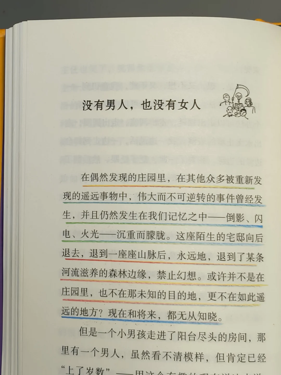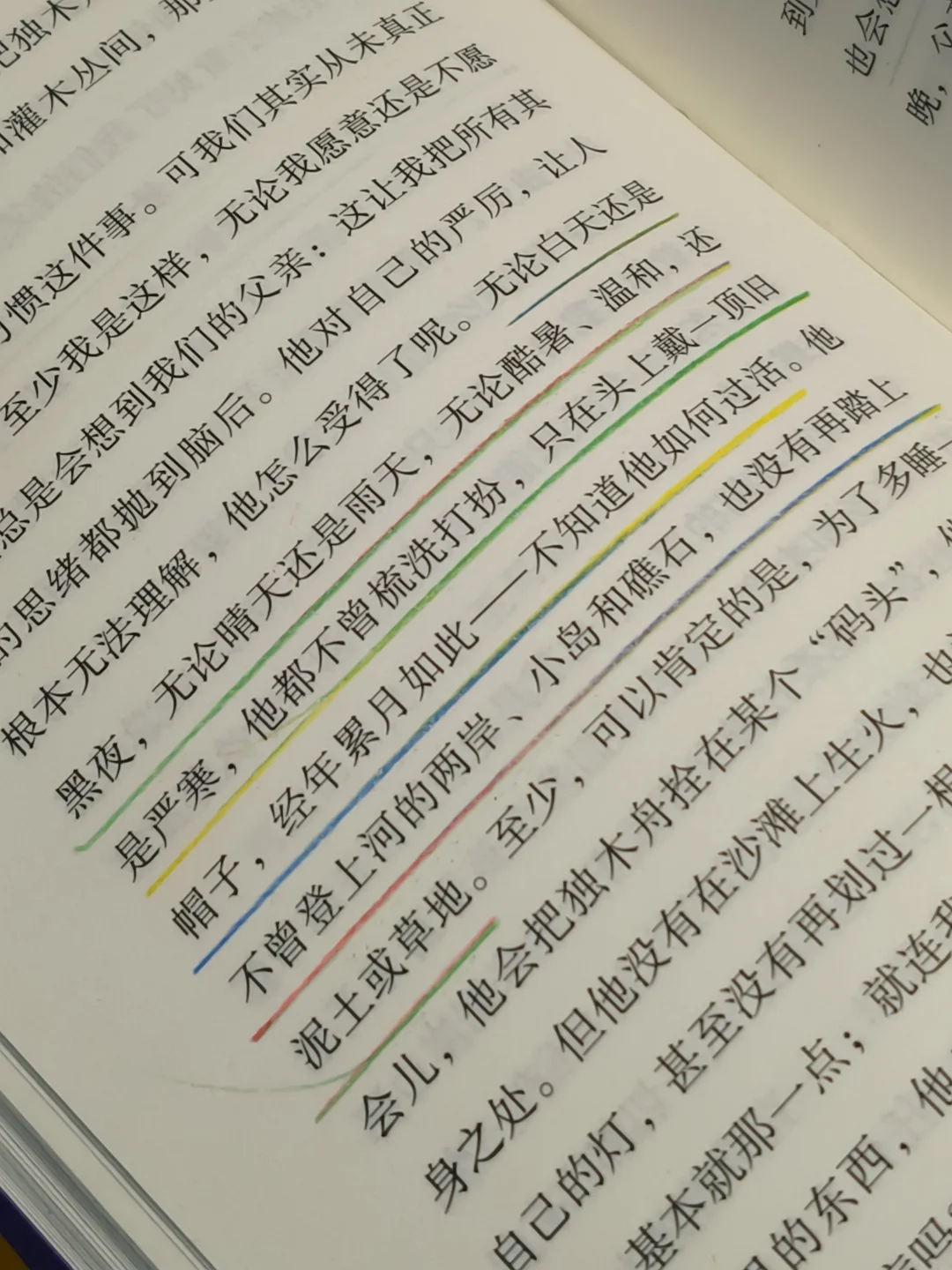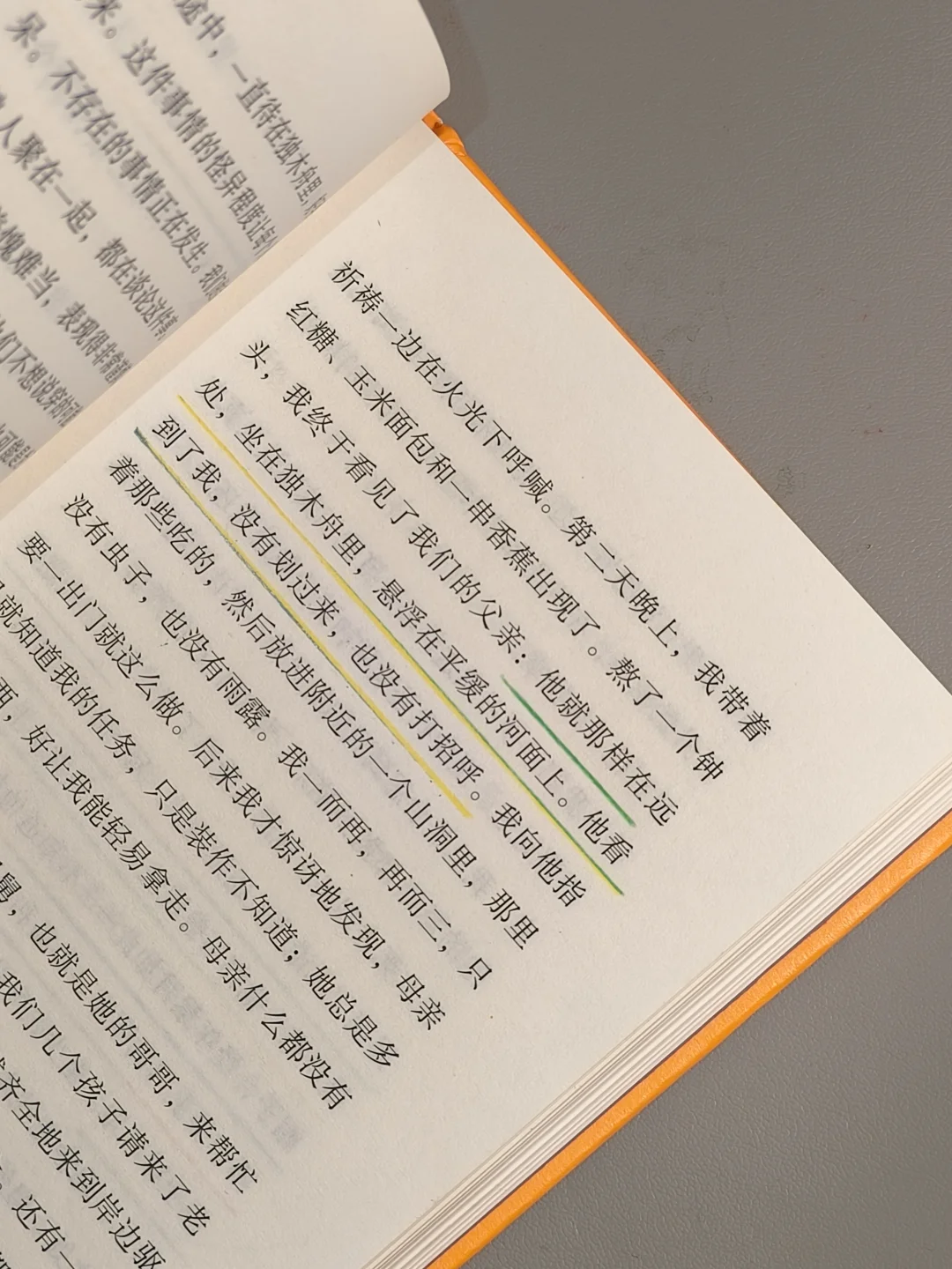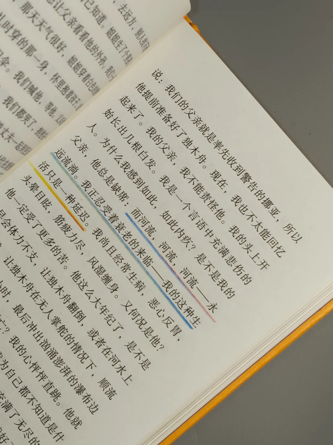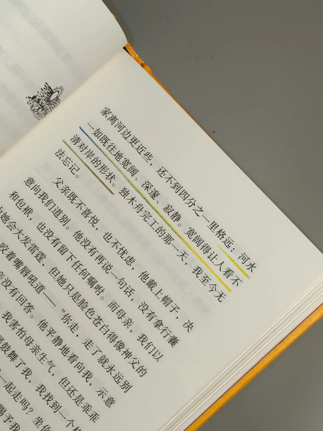 “河⽔⼀如既往地宽阔、深邃、寂静。宽阔得让⼈看不清对岸的形状。”