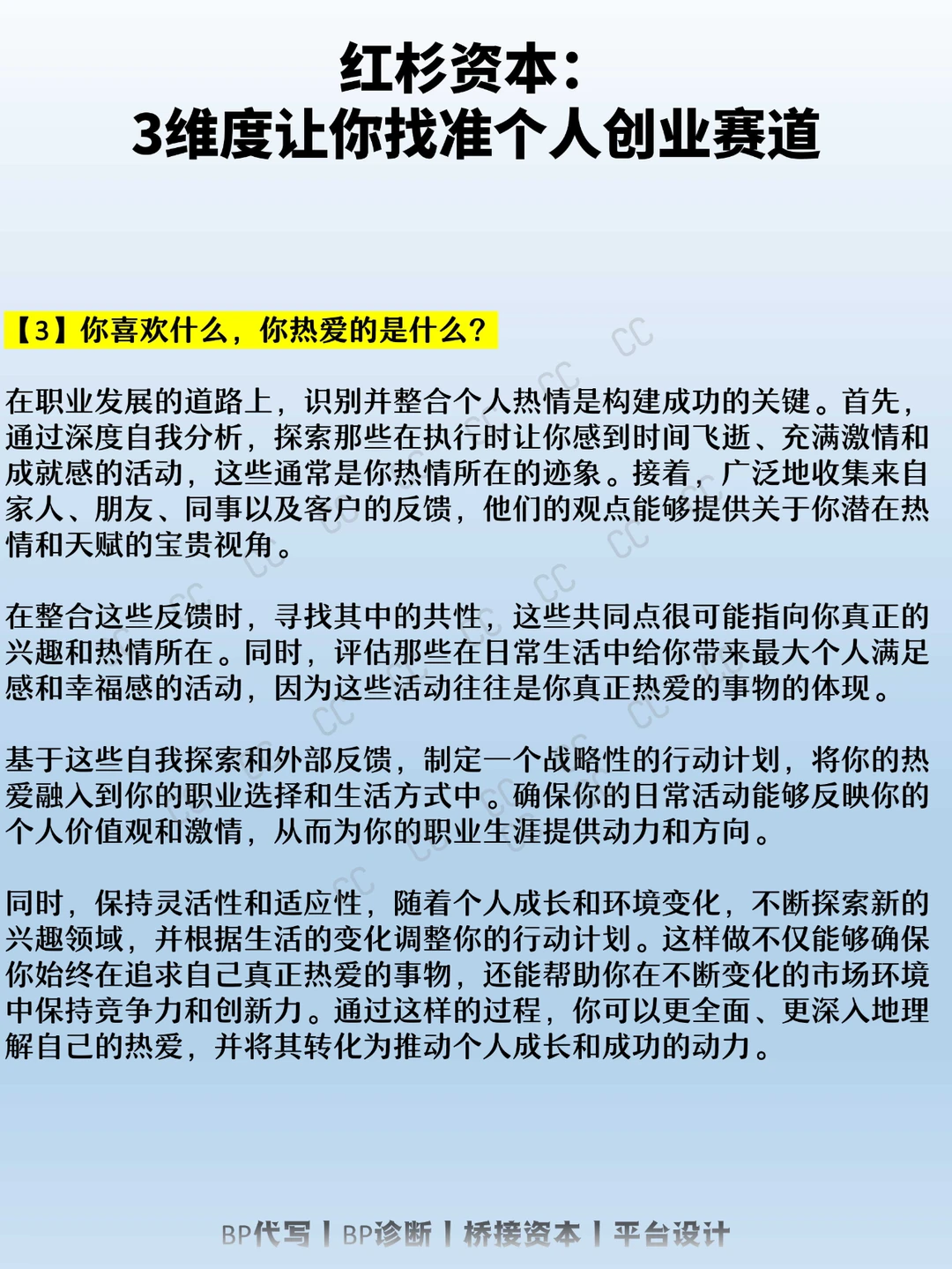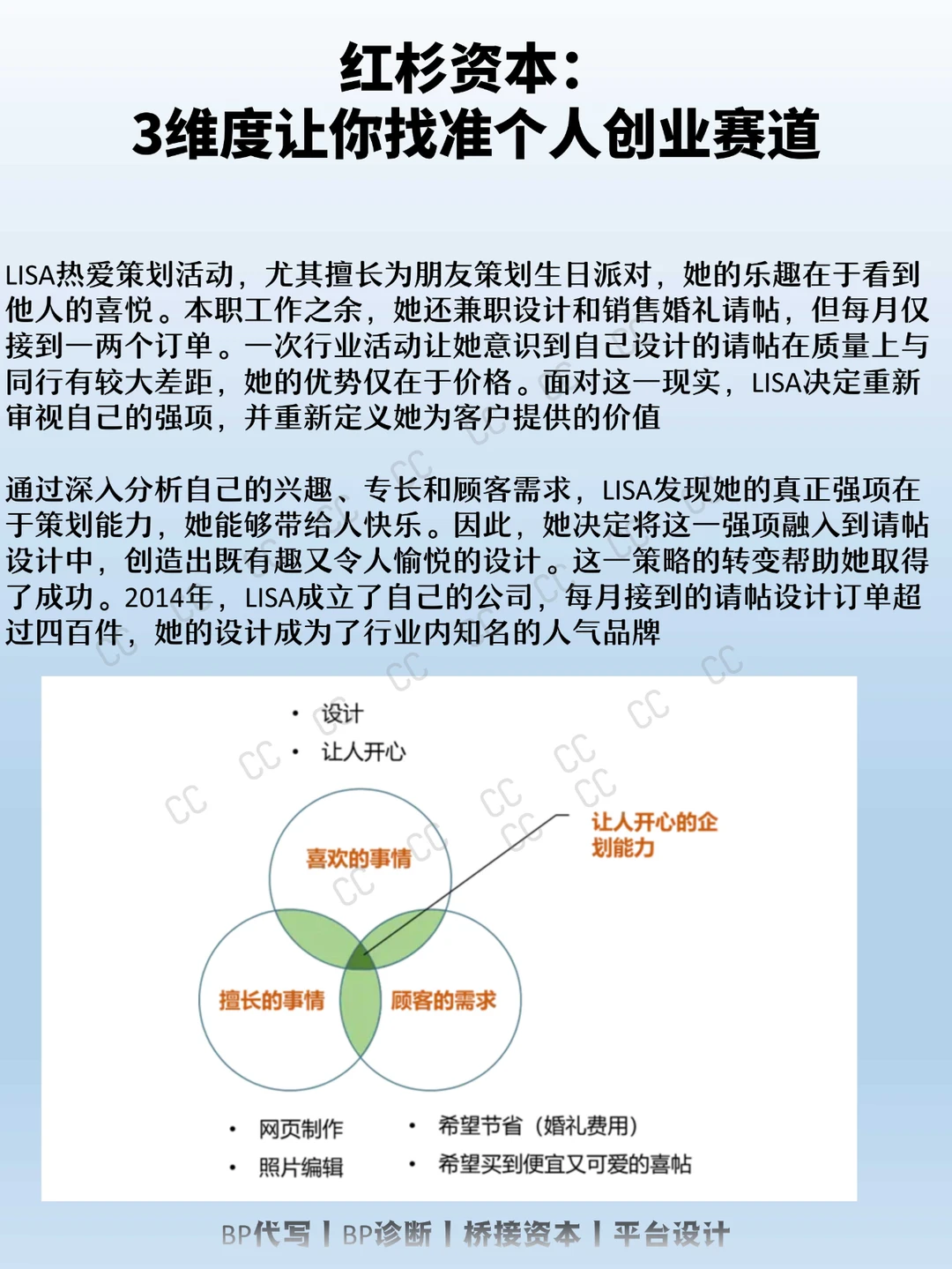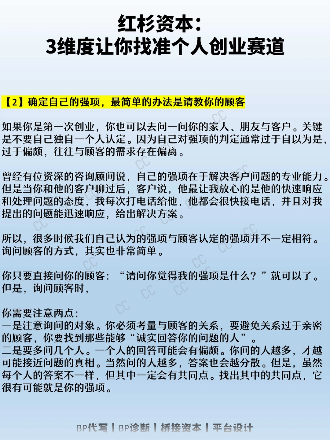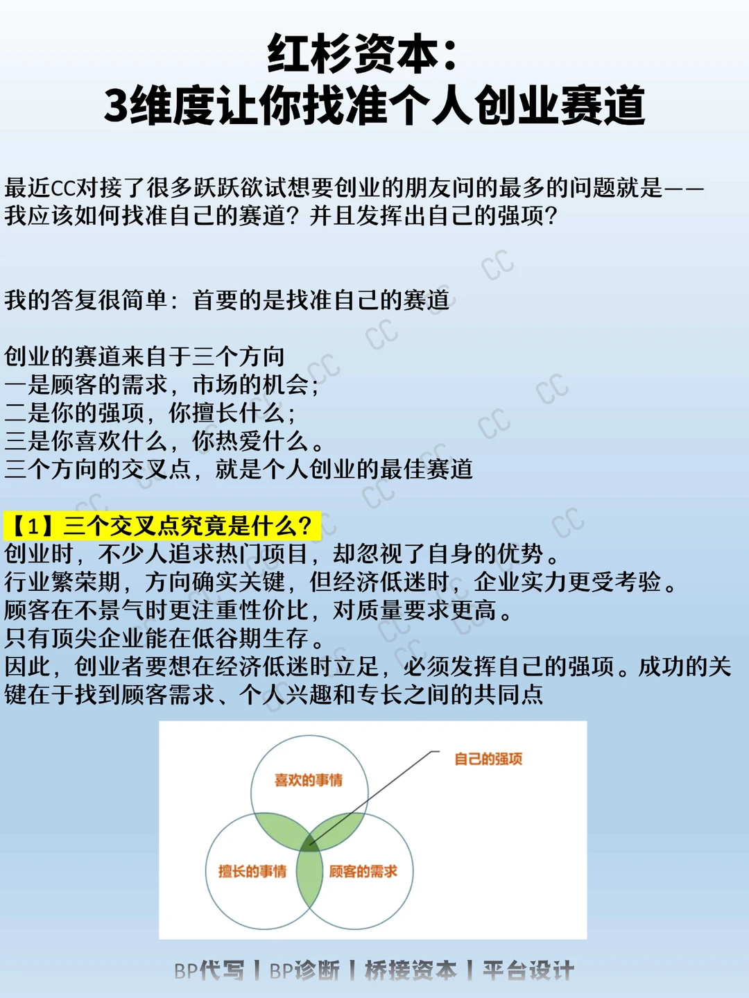 最近CC对接了很多跃跃欲试想要创业的朋友问的最多的问题就是—— 我应该如何找准自己的赛道?并且发挥出自己的强项? 我的答复很简单:首要的是找准自己的赛道 创业的赛道来自于三个方向 一是顾客的需求,市场的机会; 二是你的强项,你擅长什么; 三是你喜欢什么,你热爱什么。 三个方向的交叉点,就是个人创业的最佳赛道