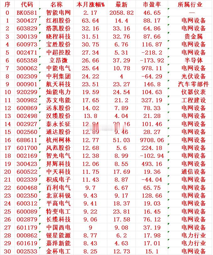 智能电网概念,十二月以来涨幅最多的30名单智能电网(指数,代码BK0581):本月涨幅 +2.17%,最新指数值 2058.82红相股份(300427):本月涨幅 +63.64%,最新价 14.40元洛凯股份(603829):本月涨幅 +32.16%,最新价 33.16元晓程科技(300134):本月涨幅 +31.51%,最新价 32.76元宝胜股份(600973):本月涨幅 +30.75%,最新价 6.76元中超控股(002471):本月涨幅 +27.34%,最新价 5.31元涨幅最多的30名单中行业龙头汇总如下:电网设备:国电南瑞(行业绝对龙头,市值超 1800 亿)、思源电气、正泰电器;贵金属:山东黄金(国内黄金龙头)、中金黄金;半导体:中芯国际(晶圆代工龙头)、北方华创(设备龙头);光伏设备:阳光电源(逆变器龙头)、隆基绿能(组件龙头);汽车零部件:宁德时代(电池龙头)、华域汽车;仪器仪表:汇川技术(工控龙头)、海康威视(智能设备龙头);工程建设:中国交建(基建龙头)、三一重工(工程机械龙头);通信设备:中兴通讯(通信设备龙头)、烽火通信;电力行业:长江电力(水电龙头)、华能国际(火电龙头)。