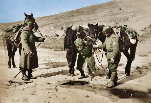 这张照片捕捉了在抗战时期,我国东北地区的残酷一幕。在寒风凛冽、荒芜萧瑟的野外,两名日军士兵正对一名被俘的东北军战士进行严酷的审讯。 画面中,被俘战士身着厚重的棉衣和棉帽,双手被反绑,一名日军正粗暴地将他推向地面的一个在河面凿出的深洞,企图以死亡的威胁逼迫他吐露情报。这幅画面是抗战岁月中无数中华儿女坚贞不屈、视死如归的英勇写照。