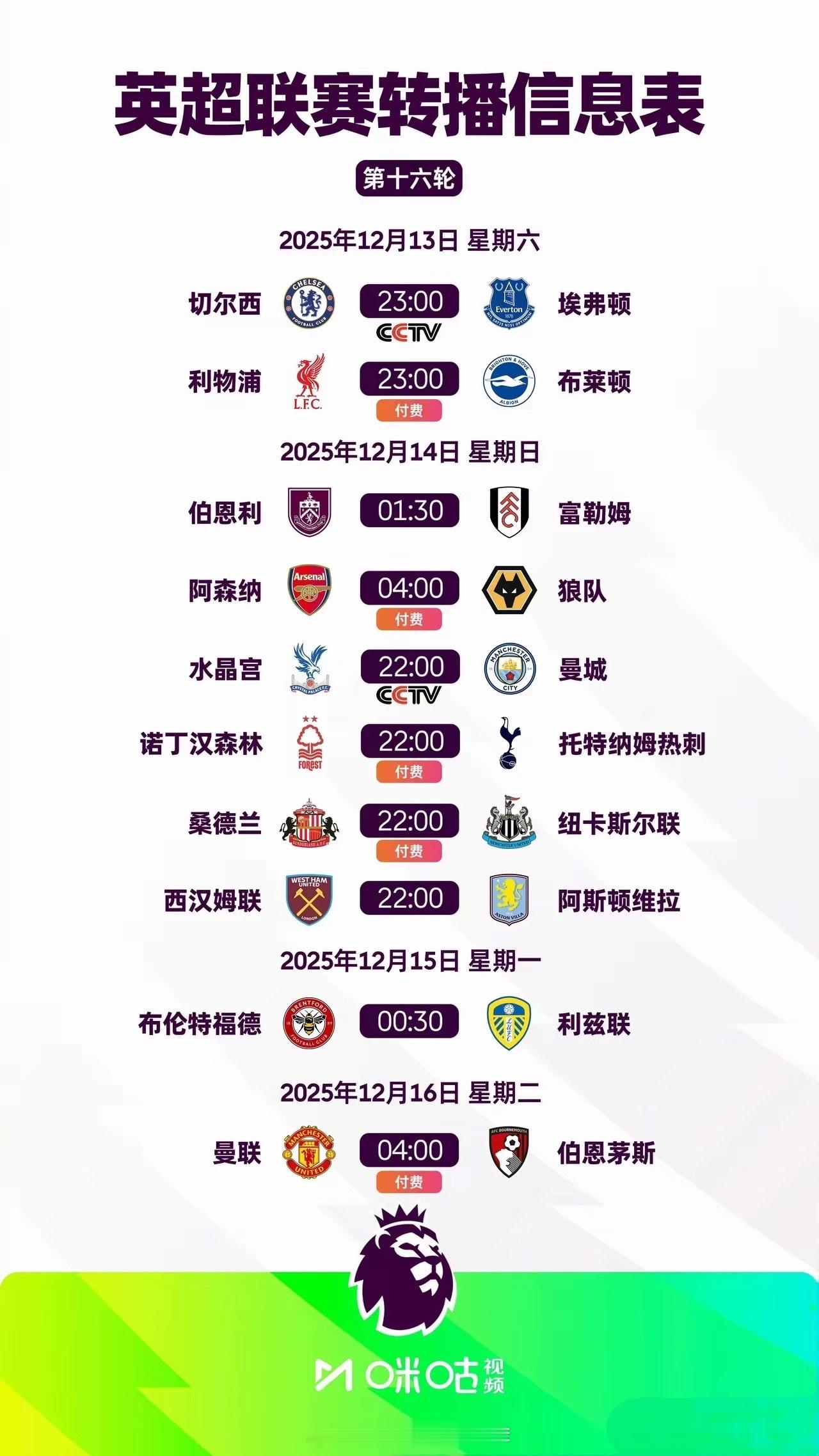 本周英超5场免费转播,CCTV5转播其中最精彩的两场,而利物浦、阿森纳、热刺、曼联的比赛,仍然是咪咕独播,不过比赛时间可不咋方便,只有利物浦在23点的球,可以算黄金时间段。尤其是曼联的比赛,又是凌晨4点,这可苦了国内曼联的球迷了,连续很多场,都是这么尴尬的时间端,想看也熬不住啊!
