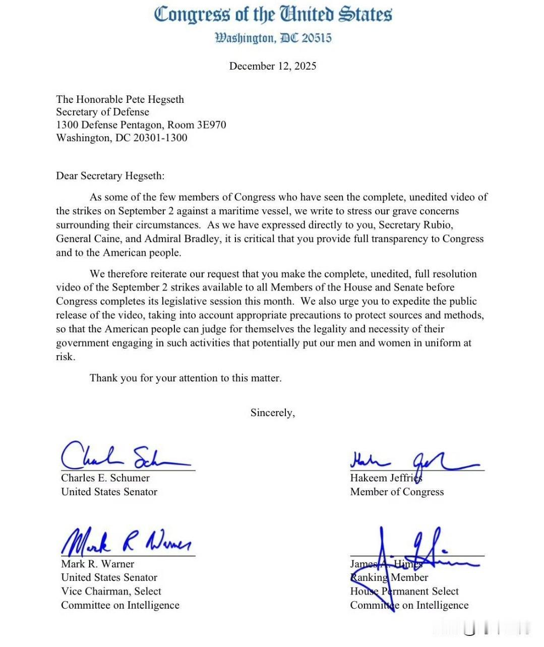 川皇的委内瑞拉计划遭遇严重的威胁 12 月 13 日,国会“八人帮”中的全部民主党成员——参院民主党领袖舒默、众院民主党领袖杰弗里斯、参院情报委员会副主席华纳、众院情报委员会首席成员希姆斯——联名致函国防部长赫格塞斯,要求公开 9 月 2 日加勒比海“二次打击”事件的完整、未剪辑视频。他们在信中表示: “作为少数看过完整视频的议员,我们强烈认为必须向国会和美国人民提供完全透明度……让美国人民自己判断。” 舒默随后在院会发言中强调,这并非党派之争,“参众两院、两党成员都要求公布录像”,并质问赫格塞斯“到底在隐瞒什么”。 目前,民主党人正推动在年度国防授权法案中加入条款:若国防部不交片,就砍掉赫格塞斯 25% 的差旅预算。 "美国以'反毒'为名剑指委内瑞拉,实为维护美元霸权。 全球80%石油贸易用美元结算的秩序正遭挑战。 半个世纪的'反毒战争'花费万亿,却让军工复合体赚得盆满钵满。 真相是:毒品是剧本,石油是舞台,美元才是永不落幕的主角。"