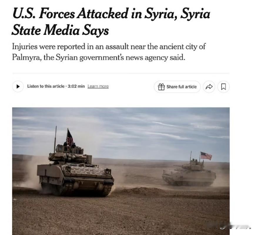 美军在叙利亚遭到袭击。 据叙利亚国家通讯社SANA报道,周六,美军和叙利亚军队在古城帕尔米拉附近进行联合巡逻时遭到炮火袭击。该机构援引一名安全消息人士的话称,至少有两名叙利亚安全部队成员和一些美军士兵受伤。 一位要求匿名的美国军方官员称其为“情况严重”,并表示随着五角大楼从前线指挥官处获得最新消息,可能会有更多细节公布。据叙利亚通讯社报道,一名袭击叙利亚和美国军队的枪手已被击毙,但该枪手的身份或动机等细节仍不清楚。