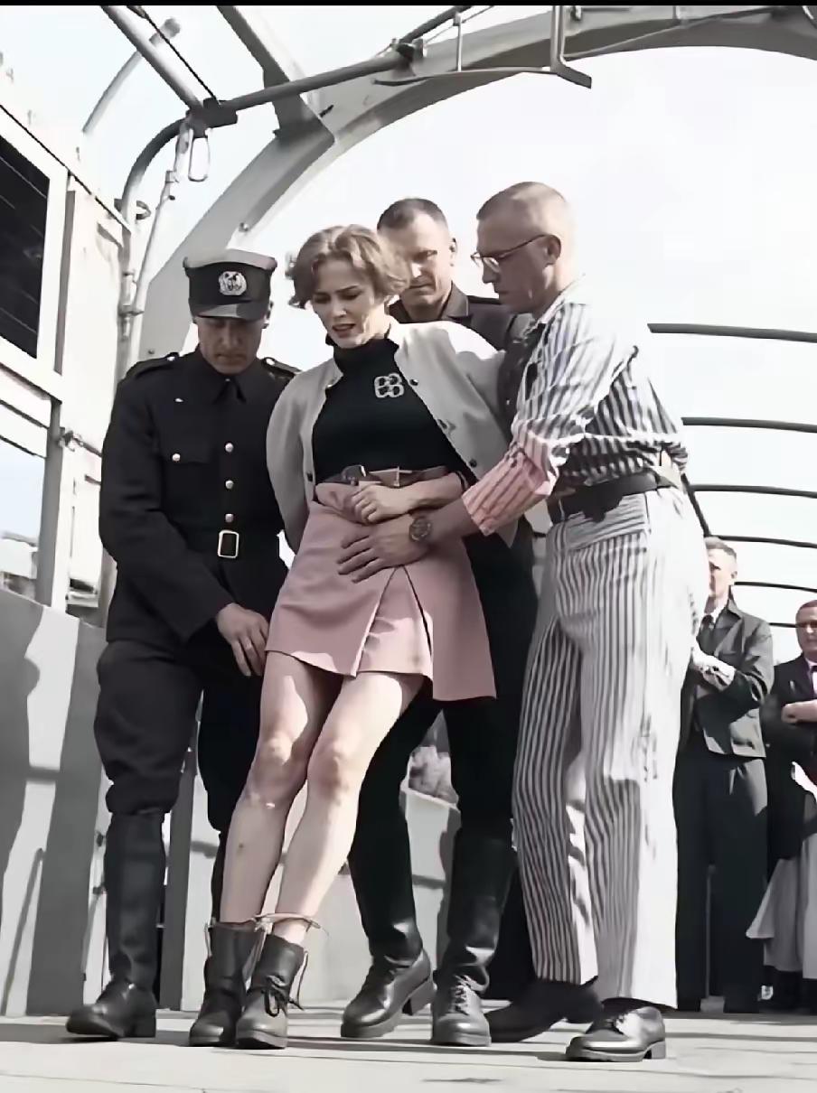 行刑前走上断头台的伊丽莎白。这和英国女王没有丁点儿关系。这是条心如蛇蝎的毒美女蛇。可别被她衣冠楚楚的美丽外表所欺骗。她曾在德军设立的斯图特霍夫集中营担任看守,尽管长得一副人模狗样,却有着残忍恶魔般的心。她以虐待囚犯为乐趣,还收集并保存了由受害者皮肤制成的手包、手表带等物品。将她处以极刑一点儿也不亏,罪有应得!