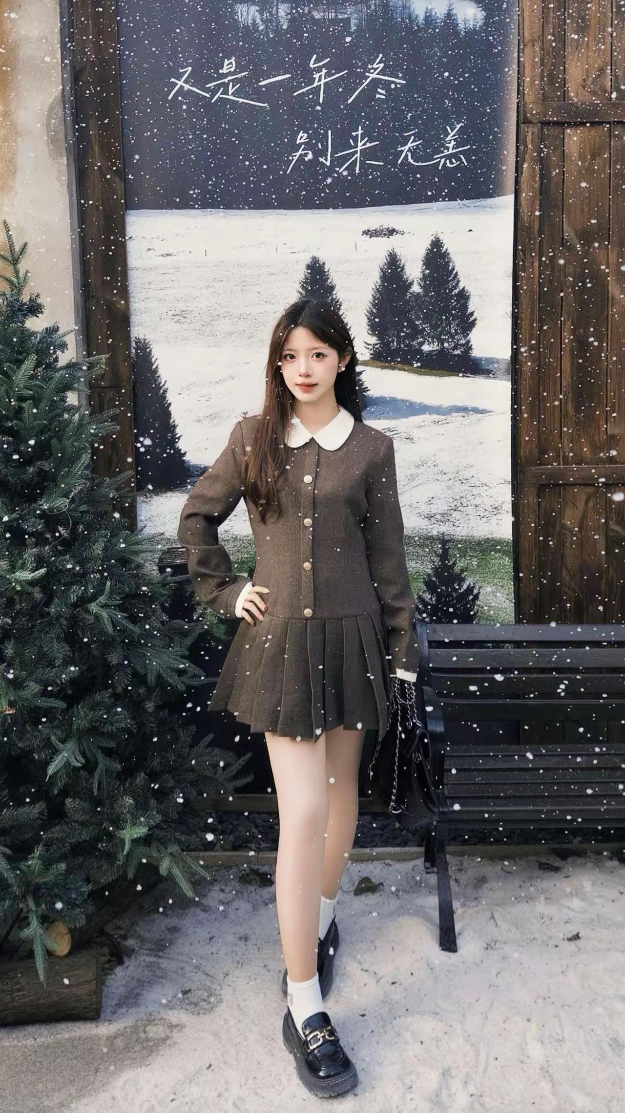 大雪纷飞,白雪皑皑银装素裹,短裙保暖丝袜搭配,年轻时尚,清纯可爱活泼动人