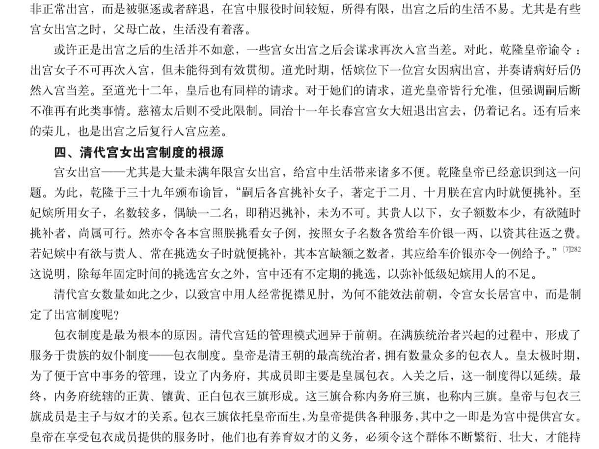 宫女干到25岁就可以出宫了这个题目就很蠢了,所以评论区不买账。出宫绝不等于退休荣养!¹ 而且谁说25岁就一定能出宫?实际上很多宫女不到25岁就会被赶出去。因笨出宫、因病出宫,才是清代宫女被赶出宫的最最主要原因。² 相当于不给你养老,年纪大了或者病了就提前裁掉,自谋生路。³ 清代对宫女的待遇,相较于以往王朝,已经算进步了。一是不让大量宫女老死宫中。故宫宫女多的时候才两百多!皇太后才能用12个,皇后10个,皇贵妃和贵妃8个,答应才1个。二是让她们出去结婚,因为她们很多是奴才,要出去给主人生小奴才。热点科普