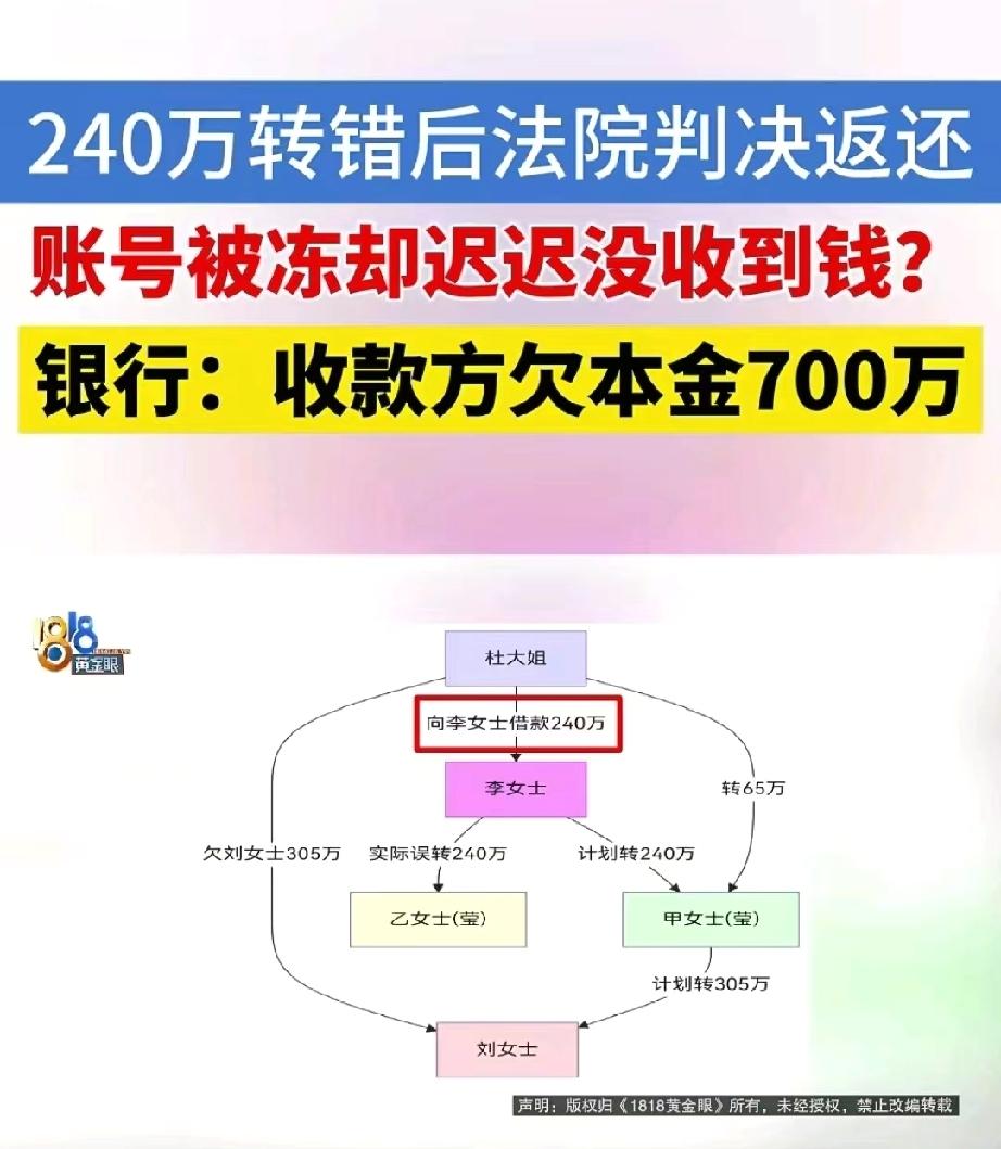 浙江宁波,女子好心给朋友借款240万,用手机银行转账时,她一边打电话一边分心操作转账,结果不小心转给了同名不同姓的另一个朋友。得知转错后,女子赶紧报警,并第一时间提起诉讼,法院认定收款的朋友构成不当得利,判决其10日内退还这240万。可谁知,银行冻结了该朋友的账户,声称该朋友欠银行逾期贷款本金700万,需要划扣其账户余额。女子拿着判决掰扯了一年,只能提起执行异议诉讼,没想到,法院的判决完全出乎意料。 李女士是个爽快的人,遇到朋友有困难,她经常仗义出手,可谁知,一次好心帮朋友周转的240万,让她陷入长达一年的维权拉锯战。 事情要从去年年底说起,李女士的朋友杜大姐欠了刘女士305万,还款日期迫在眉睫,杜大姐手里只有65万,便找上李女士借240万救急。 为了资金安全,两人商量好,把钱先转给共同的朋友贾莹,再由贾莹统一转给刘女士。 那天李女士一边打电话,一边忙着操作手机银行转账。 贾莹她熟得很,转账记录里也有保存,加上电话那头聊得热火朝天,她没细看收款人姓名,只瞄到名字里有个“莹”字,就直接选了记录里的账号。 手机银行转账本就快捷,第一笔刷脸验证后,后面两笔更是一键确认,三笔钱合计240万,眨眼间就转了出去。 转完账,李女士还特意跟杜大姐说了句:钱转好了。 可没一会儿,杜大姐就慌慌张张打来电话:贾莹说没收到钱。 李女士心里“咯噔”一下,赶紧打开转账记录核对,这一看,魂都快吓飞了。 原来,她把钱转给了另一个也叫“莹”的朋友乙女士,两人同名不同姓,自己当初存过对方的账号,这下彻底弄混了。 李女士吓得心脏砰砰直跳,240万不是小数目,她第一时间给银行打电话,又火急火燎地报了警。 民警提醒她,这种情况得赶紧走法律程序,李女士不敢耽搁,当天就向法院提起了诉讼,申请冻结乙女士的账户。 案件事实很清楚,确实是李女士转错了账,相关的证据链也很完整,法院很快就梳理了案件的来龙去脉。 今年2月,法院经过审理认定乙女士构成不当得利,判决她在10日内返还李女士240万。 拿到判决书的那一刻,李女士悬了许久的心终于落了地,她以为这事总算是圆满解决了。 可现实却给了她当头一棒。她兴冲冲去申请执行,却被告知乙女士的账户早就被徽商银行余姚冻结了。 原来乙女士欠了银行700万的经营性贷款,逾期已久,银行早就向法院申请了财产保全。 这下李女士彻底懵了,明明法院都判了钱是自己的,怎么就拿不回来了? 她一次次跑银行沟通,对方一开始还安抚她:银行不会要外人的钱。 可后来银行态度越来越冷淡,又说这事已经交给法务处理,让她等消息。 这一等,就是大半年。更让她糟心的是,期间宁波市鄞州法院还从乙女士的账户里划扣了87万多,用来清偿乙女士的另一笔债务。 李女士实在没办法,只能再次提起执行异议诉讼,要求解除账户冻结,拿回属于自己的240万。 今年10月,法院的裁定结果出来,却让李女士彻底陷入绝望。 对于异议申请,法院认为她享有的权利无法对抗银行的强制执行,驳回了她的执行异议。 李女士走投无路,只能提起异议之诉。 从法律角度来看,乙女士构成不当得利,确实有返还的义务。 《民法典》第九百八十五条规定:得利人没有法律根据取得不当利益的,受损失的人可以请求得利人返还取得的利益,但是有下列情形之一的除外: (一)为履行道德义务进行的给付;(二)债务到期之前的清偿;(三)明知无给付义务而进行的债务清偿。 本案中,李女士因分心操作,误将240万转给同名不同姓的乙女士,这既不是李女士的真实赠与意思,也无双方约定的债权债务关系,完全属于不当得利。 李女士提交的转账记录、与杜大姐及贾莹的沟通记录等证据,清晰证明了转错账的事实和自身损失,因此乙女士返还240万是合法合理的。 那么,赢了官司却拿不到钱,这到底是怎么回事呢? 《最高人民法院关于人民法院办理执行异议和复议案件若干问题的规定》第八条规定:案外人基于实体权利既对执行标的提出排除执行异议又作为利害关系人提出执行行为异议的,人民法院应当依照有关规定进行审查。 李女士虽通过不当得利诉讼获得返还判决,但该权利属于普通债权,无优先受偿效力。 而徽商银行对乙女士享有的是700万逾期贷款债权,且已通过法院合法冻结乙女士账户,属于合法的执行保全措施。 法院审查执行异议时,核心考量“权利优先性”,银行的债权执行具有合法性和在先性,李女士的普通债权无法对抗法院已启动的强制执行程序。 因此,法院注定会驳回李女士的执行异议,这并非否定不当得利判决的效力,而是在执行程序中遵循“优先受偿权优于普通债权”的原则。 李女士好心帮人,最后因为一时大意,落到了这进退两难的地步。