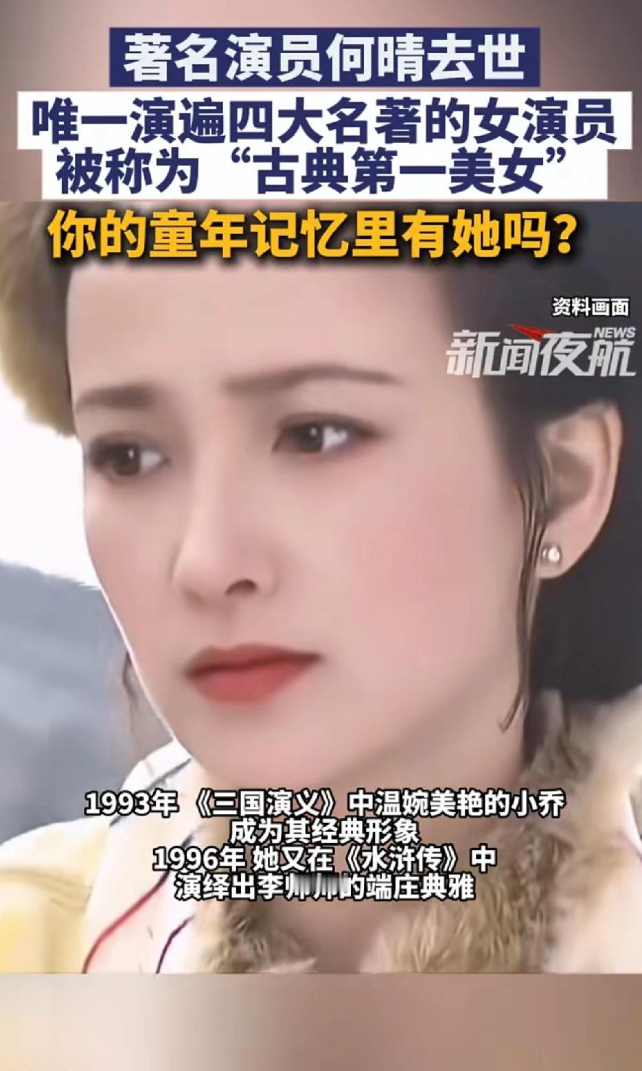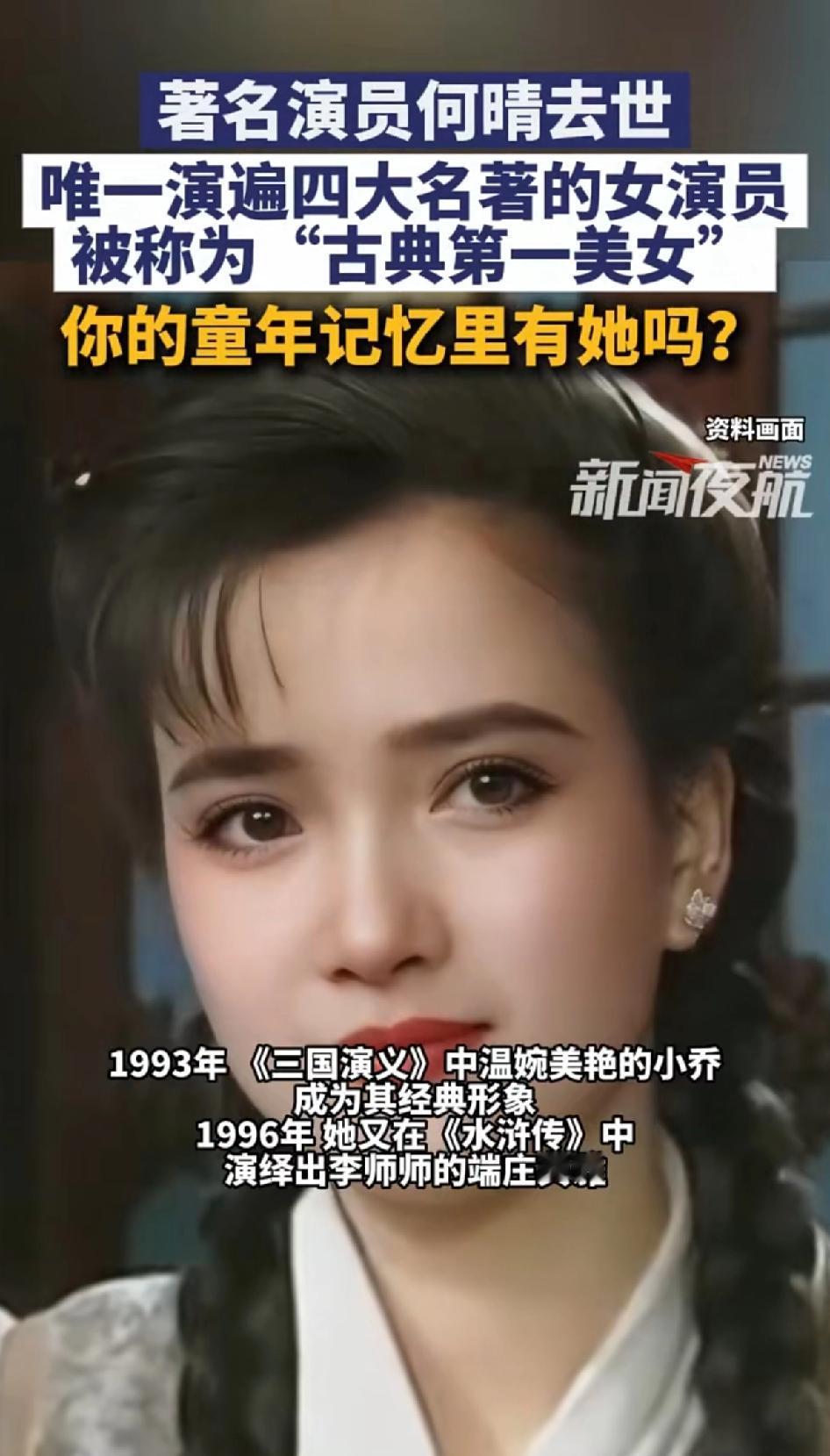 著名演员何晴去世!唯一演遍四大名著的女演员。 2025年12月13日,著名演员何晴在北京离世,享年61岁,告别仪式12月15日在昌平殡仪馆举行。她是内地唯一演遍四大名著的女演员,堪称“古典第一美女”。 1984年《西游记》里她是怜怜,1988年《红楼梦》中塑造了秦可卿,1993年《三国演义》里温婉小乔成经典,1996年《水浒传》李师师端庄典雅。 此外,她还在《青青河边草》《澳门的故事》等剧有精彩表现。六小龄童称她深谙昆曲。她生病后想低调,那就让我们记住她荧幕上的绝美形象吧。