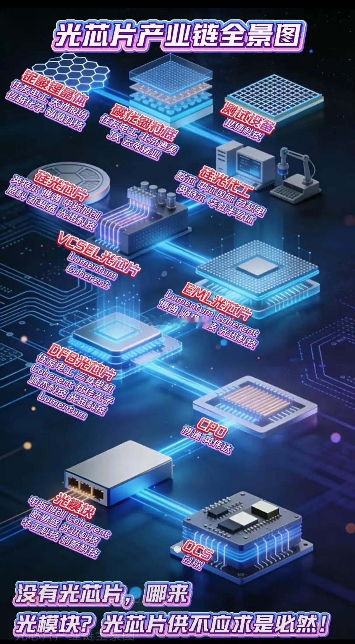 光芯片缺口持续扩大,中国企业如何突破产业链瓶颈?当AI算力、光通信对光芯片的需求呈指数级增长,光芯片产业链的供需矛盾愈发突出,而从衬底材料到光模块的全链条布局中,中国企业正沿着“材料突破、芯片追赶、封装领跑”的路径,在全球光芯片产业的竞争中撕开突围缺口。上游材料环节是光芯片的技术根基,钽酸锂晶体领域,住友电工、信越化学长期垄断全球市场,福晶科技、天通股份则实现国产晶体的小批量量产,打破海外企业的原料封锁;磷化铟衬底方面,云南锗业的外延片技术取得突破,北京通美成为国内唯一能稳定供货的企业,为光芯片制造提供了核心基材支撑。光芯片制造环节呈现“海外主导、国产追赶”的格局,VCSEL、EML、DFB等核心光芯片仍被Lumentum、Coherent等海外企业把控,但其高端产品交付周期已超6个月;国内企业的突破集中在中低端领域,光迅科技、源杰科技实现DFB光芯片的量产,博通集成的EML光芯片进入测试阶段,新易盛则在硅光芯片设计上与英特尔展开技术合作,逐步缩小与海外的代差。封装与制造配套环节成为中国企业的优势赛道,硅光代工领域,中芯国际、华虹半导体已具备28nm硅光芯片代工能力,台积电的先进制程则为高端硅光芯片提供支撑;光模块领域更是中国企业的“主场”,中际旭创、新易盛的800G光模块市占率超全球50%,华工科技、剑桥科技的光模块产品适配AI算力集群需求,成为英伟达、谷歌等企业的核心供应商。CPO(共封装光学)技术的突破更具标志性,博通与英伟达联合研发的CPO产品已进入量产阶段,国内企业也在该领域加速研发,试图抢占下一代光互联技术的制高点。2025年全球光芯片市场规模突破300亿美元,AI算力中心的光芯片需求年增70%,供需缺口让光芯片价格同比上涨20%。中国企业虽在核心光芯片制造上仍存短板,但在材料、封装、模块等环节的优势,已构建起产业链的“半壁江山”。当福晶科技的钽酸锂晶体、中际旭创的光模块融入全球供应链,中国光芯片产业的突围,正从“配套者”向“核心参与者”转变,而持续的技术研发投入,终将打破海外企业在高端光芯片领域的垄断。