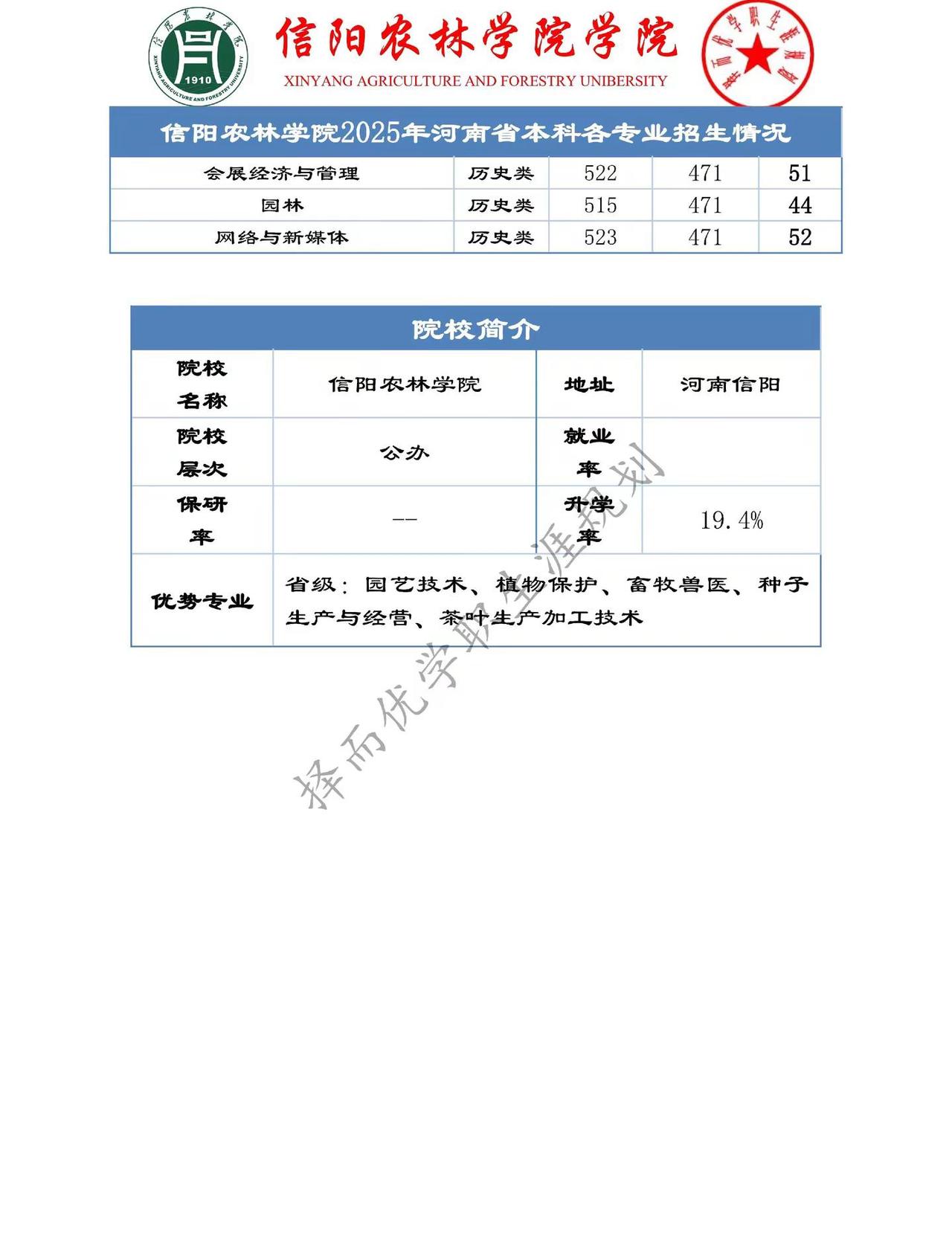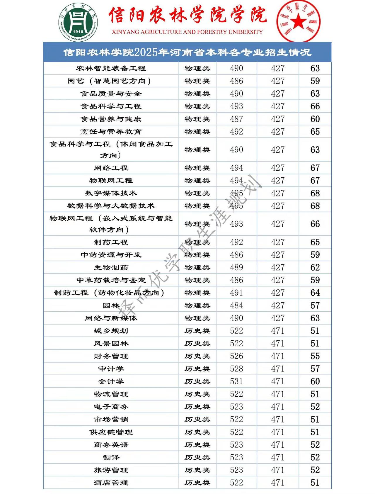2025信阳农林学院在河南本科招生情况。招生分数最高前三名分别为:历史组:会计学、审计学、财务管理,超省控线分别为60分、57分、55分。物理组:动物医学(宠物临床治疗方向)、会计学,超省控线分别为73分,71分,另外,动物医学、数字媒体技术、数据科学与大数据技术均超省控线68分,并列第三位。从以上招生情况中可以看出,信阳农信学院动物医学专业比较受欢迎,主要是因为近几年宠物经济的快速崛起。另外,进可考公退可进企业的财会类及计算机类专业依旧抢手。信阳农林学院 河南高考 高考志愿填报