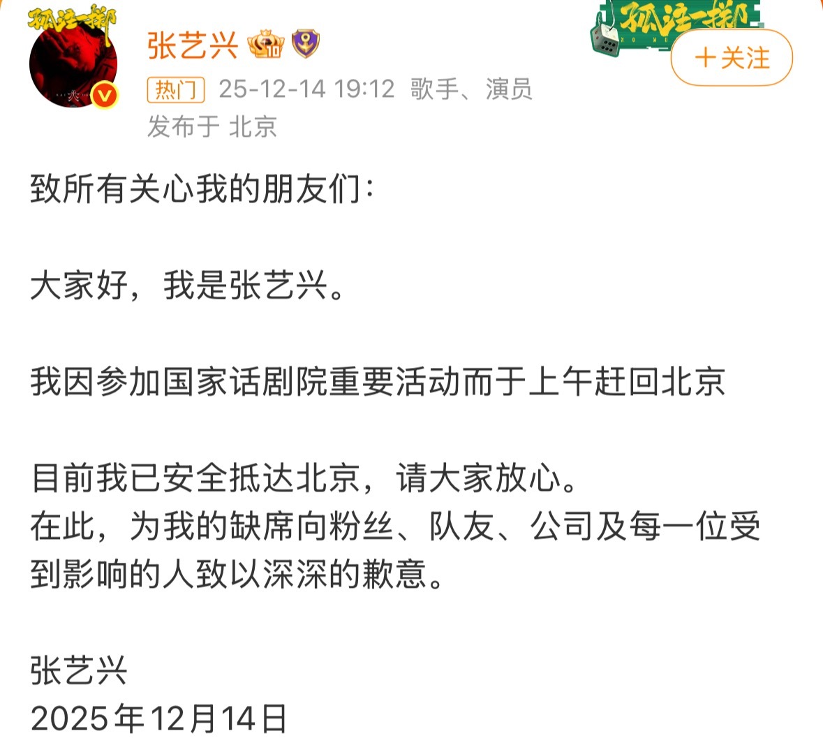张艺兴因缺席EXO粉丝见面会发博道歉张艺兴发博道歉