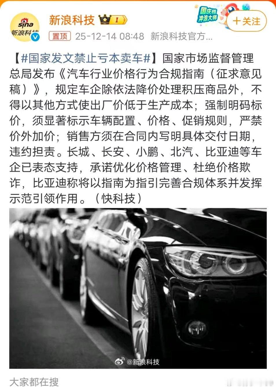 规定车企除依法降价处理积压商品外,不得以其他方式使出厂价低于生产成本;强制明码标价,须显著标示车辆配置、价格、促销规则,严禁价外加价;销售方须在合同内写明具体交付日期,违约担责。长城、长安、小鹏、北汽、比亚迪等车企已表态支持。国家发文禁止亏本卖车