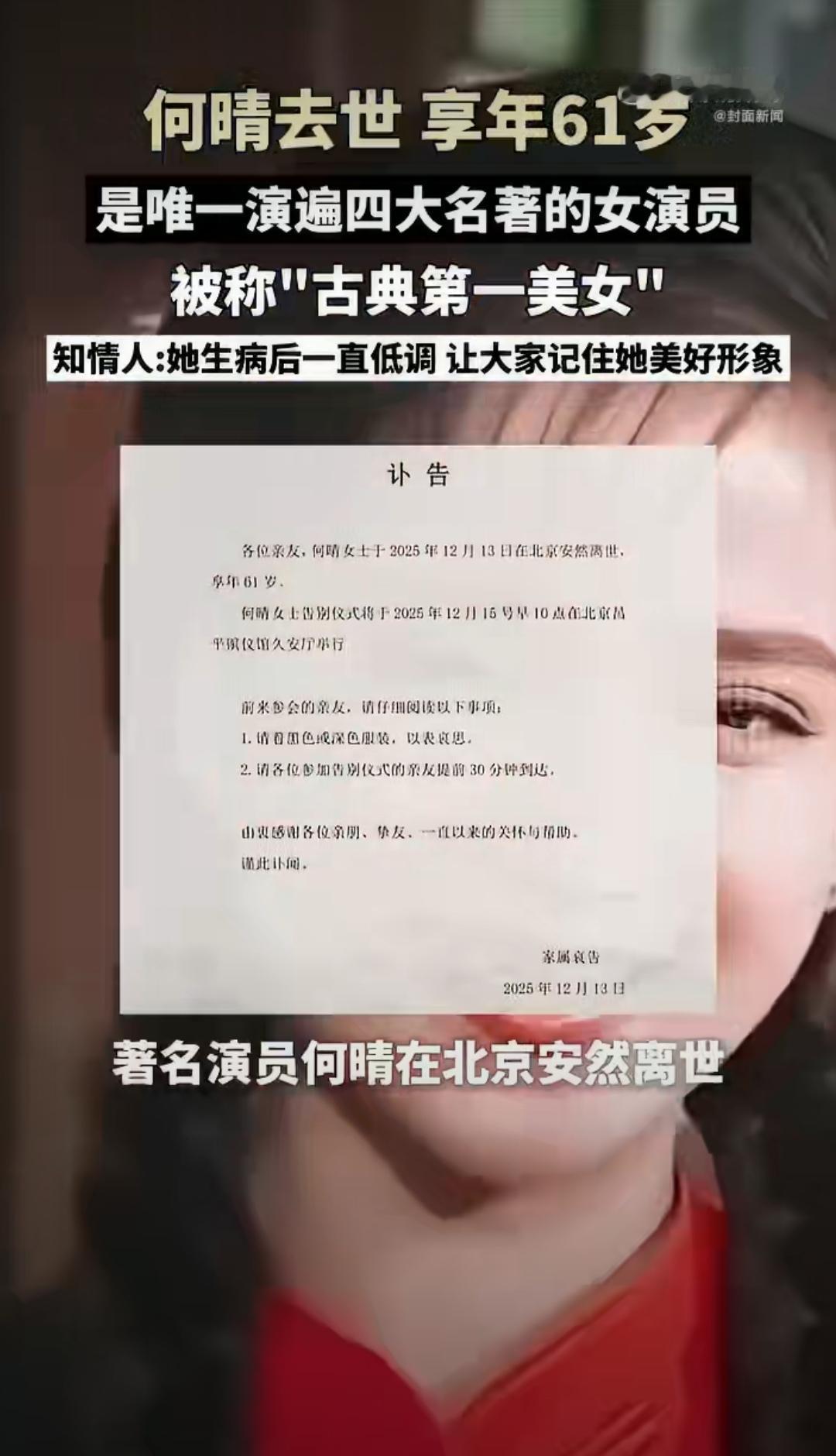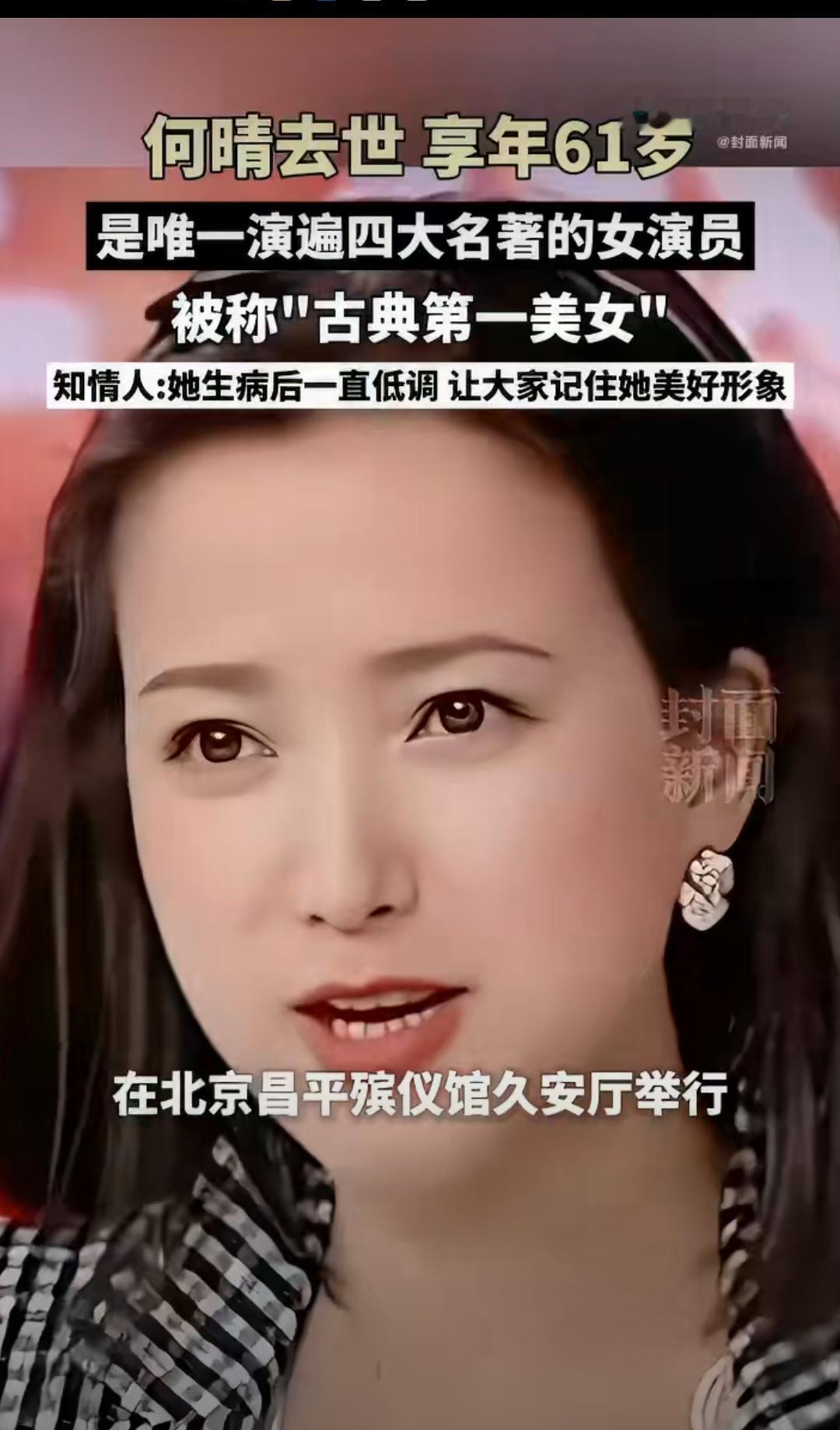 泪目!演遍四大名著的古典美人何晴离世,两段情史藏遗憾,24岁儿子眉眼复刻妈妈神韵。 噩耗传来!61岁“古典第一美人”何晴安然离世,12月15日将举行告别仪式,几代人的童年白月光终究谢幕了。 她是唯一演遍四大名著的女星,怜怜、秦可卿、小乔、李师师个个惊艳时光,戏外情路却满是波折:与刘威相恋5年高调撒糖,最终遗憾分手;和许亚军因戏生情,顶着争议成婚,儿子许何名字嵌着两人姓氏,可惜婚姻仅维持2年便因理念分歧离婚。 离婚后两人从未缺席儿子成长,11月底许亚军晒父子合照,24岁许何眉眼酷似何晴,帅气亮眼。老同事六小龄童朋友圈送别“何晴同学,一路走好”,满是惋惜。 半生璀璨半生遗憾,愿天堂没有病痛,只留她荧幕上的风华绝代!