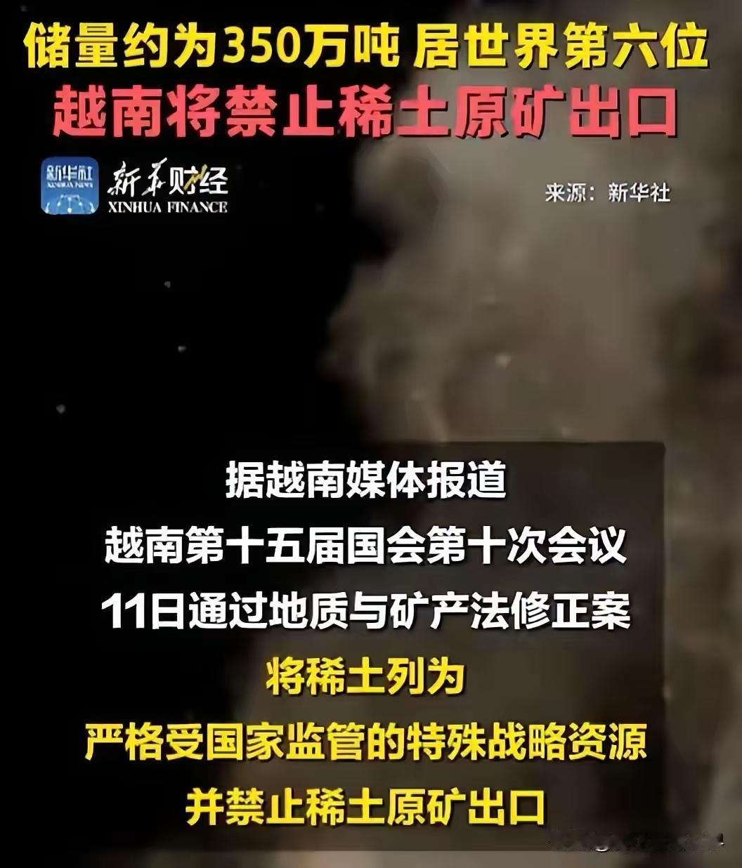 美国日本帮越南做美梦!越南通过新法案,决定自2026年1月1日起,将限制稀土原矿直接出口,把稀土列为“严格受国家监管的特殊战略资源”,并推动稀土提取、分离、深加工环节在本国落地。 越南在美日的鼓动下,想在稀土领域挑战中国,也不看看自己几斤几两!你不出口给中国,不就是让美日看的吗?意思就是在战略上想和美日关系更近,在经济上等着美日送来投资、送来技术、送来市场,这现实吗? 网友:中国可以控制稀土出口,世界各国都可以控制稀土出口,问题是谁的专利技术就是谁的,中国的技术就是不能流出国门。 越南为自己利益不出口有啥可非议呢?又不是只向中国不出口。中国有自己的手段,你不用担心,再说稀土的关键在提纯。 我们不但有技术,还有专利墙,更有全产业链。越南很难获得技术,很难绕过专利墙,即便是上述都绕过,也有全产业链的难题,没有全产业链,制造成本就居高不下。就没有竞争力。打个比方为什么我们的鸭子卖的便宜,因为我们的鸭子也是全产业链消化。什么都浪费不了,鸭绒鸭脖鸭掌鸭肠鸭血都能卖钱,所以鸭肉就可以卖的便宜。如果其他的没人要,那么鸭肉的成本就高很多。稀土也是一样的道理。