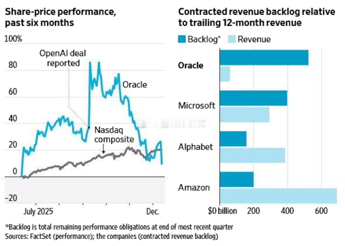 转:甲骨文为何大跌?事后分析甲骨文高达5230亿美元的已签约未实现收入绝大部分依赖于单一客户OpenAI,其积压订单与年收入之比接近九倍,远超微软等竞争对手。在谷歌Gemini 3等强力竞品出现,导致OpenAI自身履约能力面临不确定性的背景下,甲骨文为服务此单一客户而进行的大规模、高杠杆的资本投入,已使其现金流与债务状况显著区别于其他大型科技公司