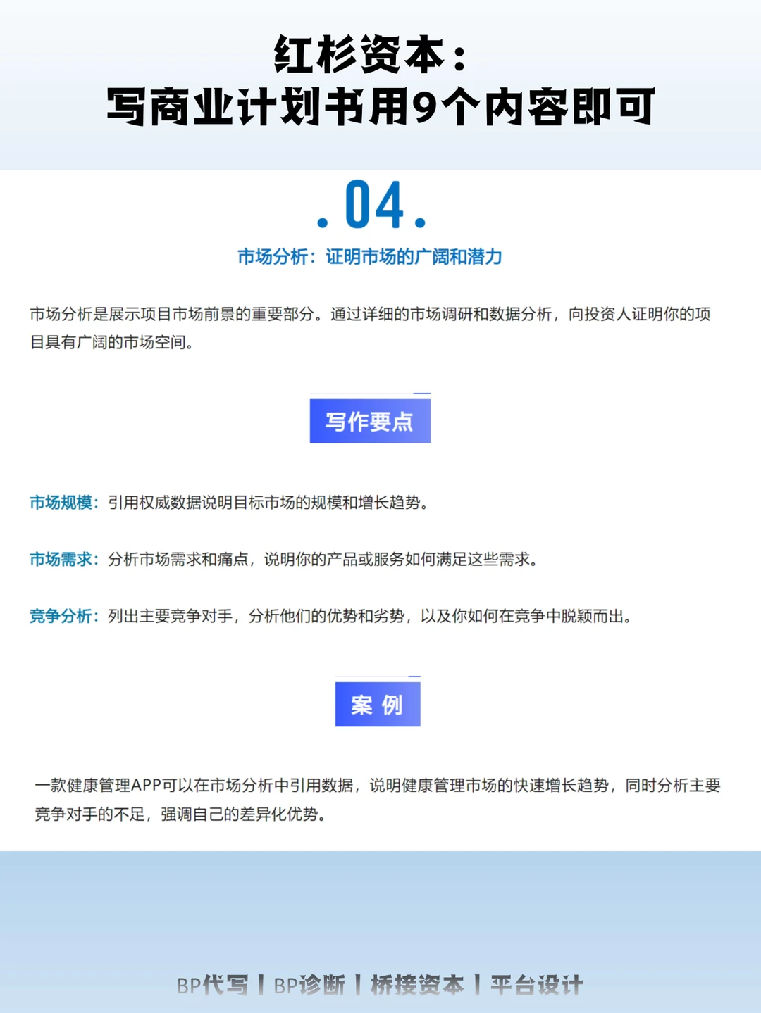3. 市场分析:对目标市场进行深入分析,包括市场规模、增长趋势、客户需求、客户分析和竞争对手分析