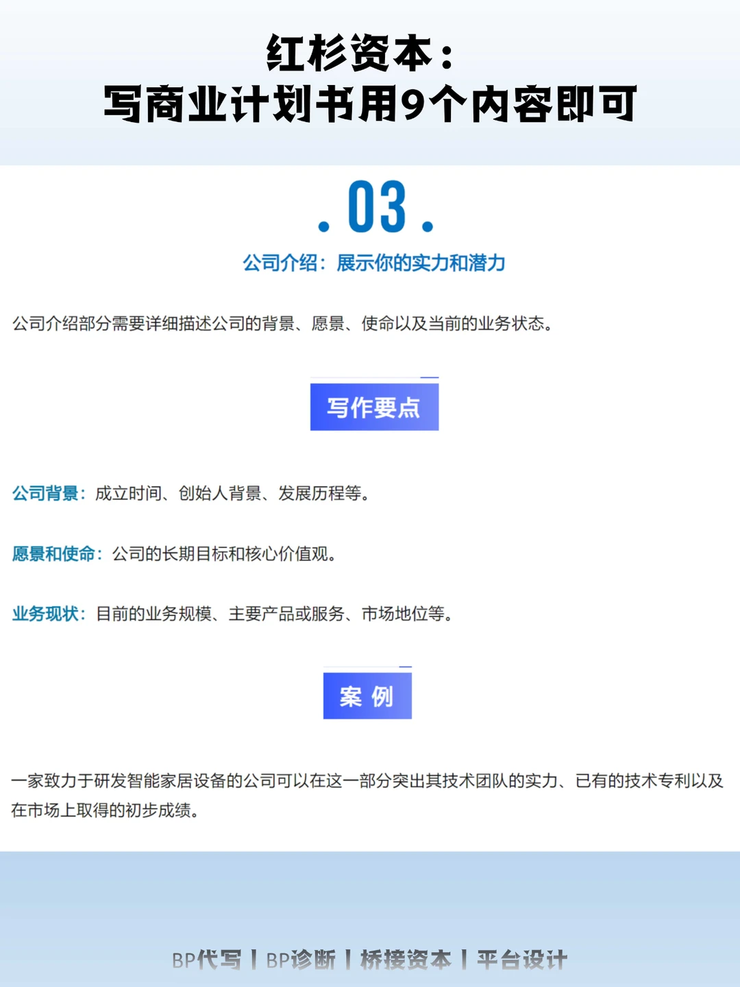 2. 公司描述:详细介绍公司历史、使命、愿景、目标、产品或服务、所有权结构和公司战略
