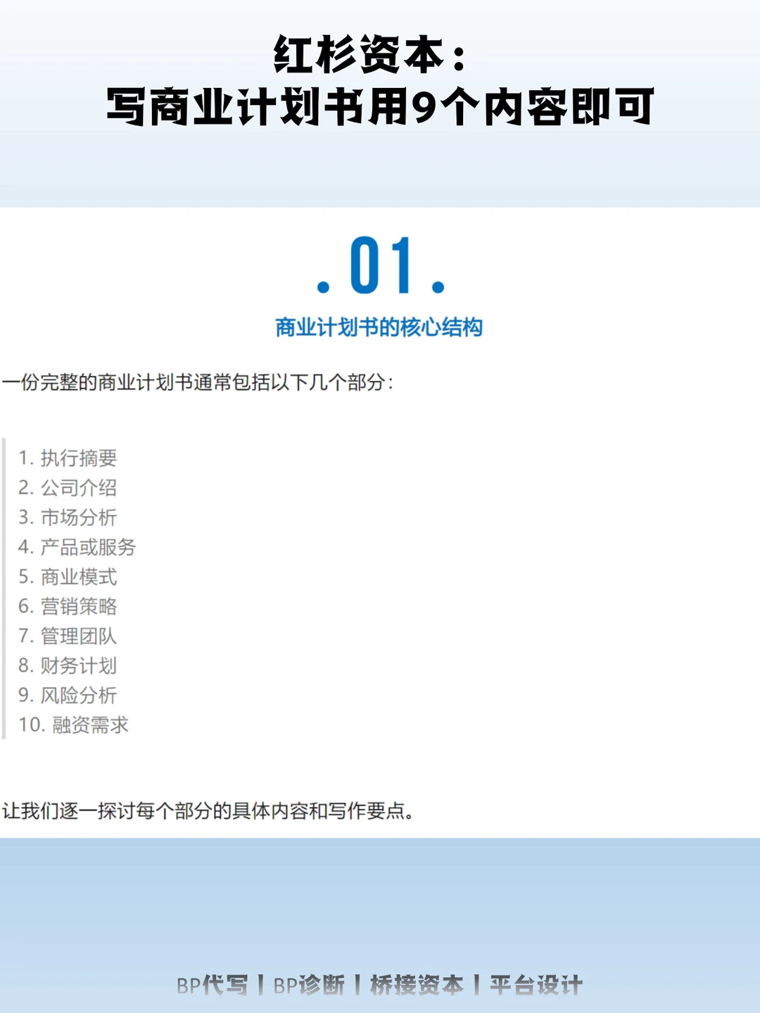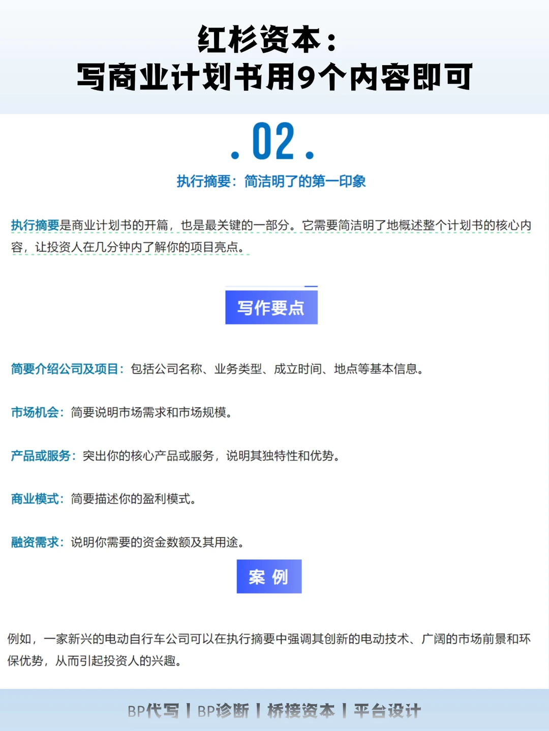 1. 摘要:商业计划的简短概述,包括企业基本信息、核心竞争力、目标市场、财务概况和融资需求