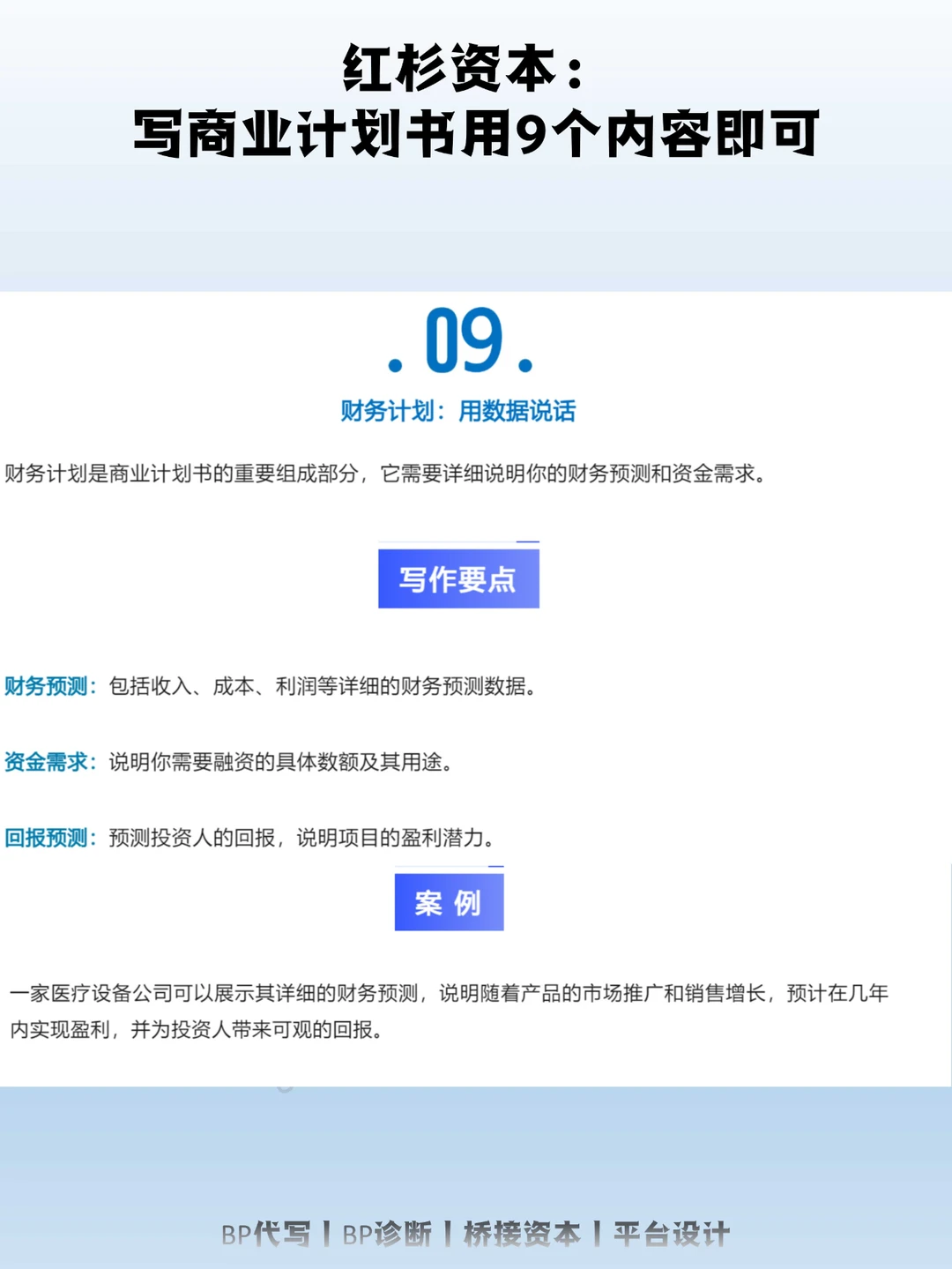 8. 财务预测:提供未来几年的财务预测,包括收入、利润、现金流量和平衡点分析