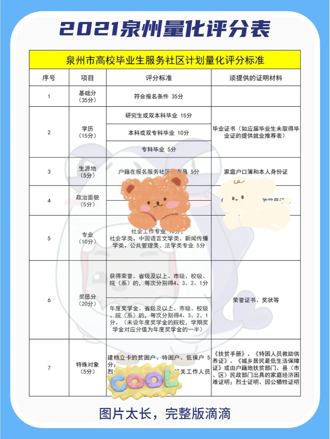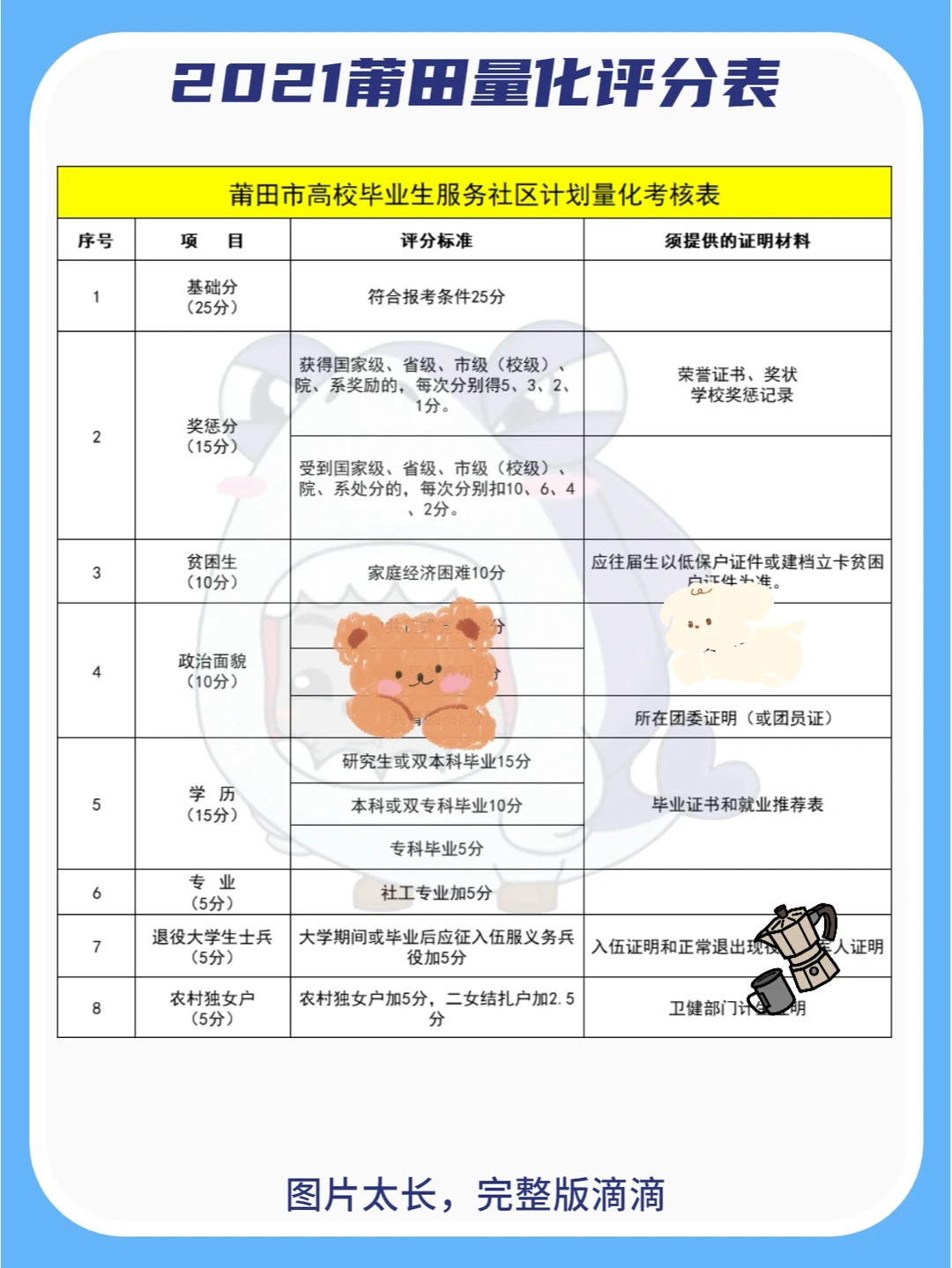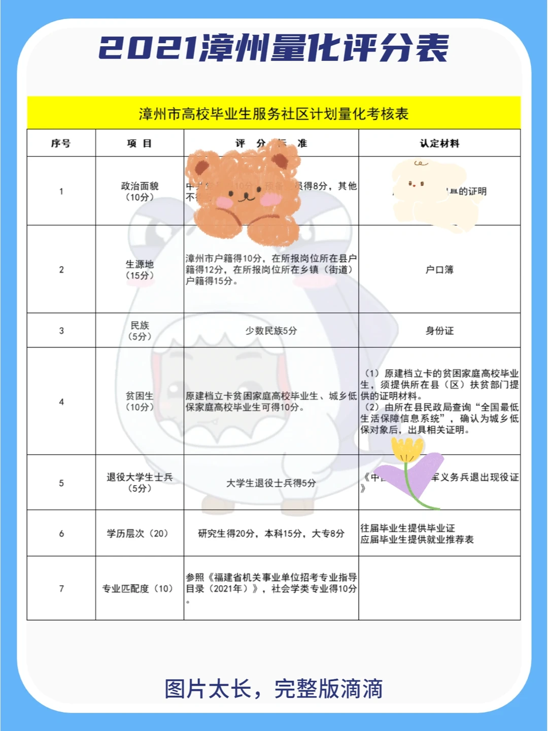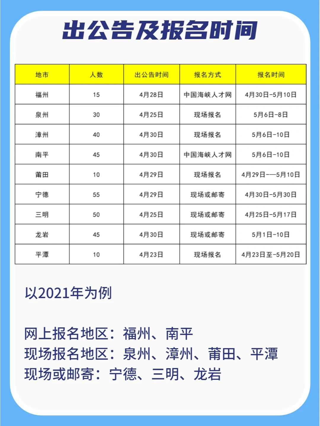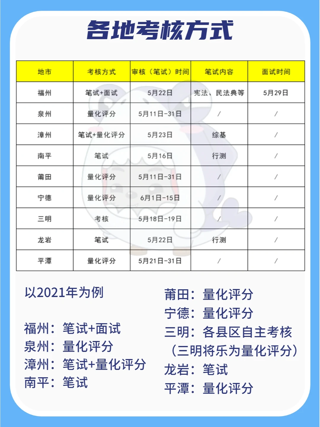 🌟1、报名方式(以2021年为例) 网上报名地区:福州、南平 现场报名地区泉州、漳州、莆田、平潭 现场或邮寄:宁德、三明、龙岩 🌟2、考核方式(以2021年为例) 福州:笔试+面试 泉州:量化评分 漳州:笔试(综基)+量化评分 南平:笔试(行测) 莆田:量化评分 宁德:量化评分 三明:各县区自主考核(将乐为量化评分) 龙岩:笔试(行测) 平潭:量化评分 🌟3、量化评分表具体内容如上
