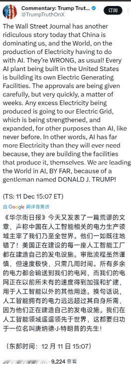 12月12日,特朗普发文写道:“《华尔街日报》今天又发表了一篇荒谬的文章,声称中国在人工智能相关的电力生产领域主宰了我们乃至全世界。他们一如既往地错了!美国正在建设的每一座人工智能工厂都在建造自己的发电设施。审批流程虽然谨慎,但速度极快,只需几周时间。所有多余的电力都会输送到我们的电网,而我们的电网正在以前所未有的速度得到加强和扩建,用于人工智能以外的其他用途。而这一切的功劳都要归功为名叫唐纳德小特朗普的先生!” 特朗普这话听起来像企业家拍胸脯的承诺书,实则藏着美国能源体系被逼到墙角的无奈。 要理解这事儿,得先看三组数字:2025年美国数据中心耗电量已占全国10%,一台AI服务器的功耗顶200台家用空调,而支撑这些算力的电网,30%的设备还在用上世纪70年代的老古董。 当微软为了跑GPT-6不得不把10万块芯片拆到八个州,当谷歌在俄亥俄州租废弃瓷砖厂当机房,这些科技巨头不是在搞分布式创新,而是被电网逼得打游击战。 特朗普的逻辑很直接:既然联邦电网指望不上,那就让企业自己搞“电力个体户”。就像沙漠里缺水的商队,与其等政府修水渠,不如每家自备水井。 这话在得州这样的“能源独立州”特别吃香——当地数据中心自建燃气电厂的速度,确实能做到审批几周落地,因为州长办公室直接给化石能源开绿灯。 但问题在于,这些自建电厂本质上是“电力租界”:谷歌在田纳西的小核电站只能供自家数据中心,微软在爱荷华的天然气机组富余电力输给电网时,还要被州政府抽一道过路费。 这种碎片化的供电模式,就像在老城区每家每户私拉电线,短期解决照明,长期只会让城市电网更混乱。 更关键的是,特朗普没提自建电厂的成本账。一座供500台AI服务器的小型燃气电厂,建设成本要8000万美元,相当于英伟达300块H100芯片的钱。 这笔钱对微软谷歌来说不算伤筋动骨,但架不住全国2000个数据中心都这么干——2025年美国企业在自建电厂上花了1200亿美元,足够翻新整个得州电网。 更讽刺的是,这些电厂烧的天然气,60%来自特朗普任内批准的页岩气项目,而开采这些天然气消耗的水量,够填满3个密歇根湖。 环保组织打官司阻挠电网升级,却默许企业自建高污染电厂,这出“环保双标戏”,本质上是能源资本在游说国会的结果。 特朗普说电网在“前所未有的扩建”,但能源部的数据更真实:2025年全美只新建了888英里高压线路,还没中国一个省的季度增量多。 弗吉尼亚州的一条输电线路,因为要穿过一片湿地,被环保团体打官司拖了四年,最后企业不得不绕道200公里,成本翻了三倍。这种“环保正确”导致的基建瘫痪,让美国在AI时代陷入两难:不修电网怕停电,修电网怕被告。 相比之下,中国内蒙古的风电基地,从立项到并网只用14个月,因为特高压线路早就跟着“东数西算”工程铺好了路基。 最致命的是时间账。特朗普说审批只要几周,但这是跳过环境评估、社区听证的“特事特办”。正常流程下,新建电厂接入电网平均要等7年——这还是在电力公司没罢工的前提下。而AI算力需求每18个月翻一番,等电厂建好,芯片功耗可能已经翻了两番。 2025年佐治亚州的AI工厂集体自建电厂,结果赶上夏季高温,居民用电激增,电厂富余电力根本送不上市政电网,最后只能拉闸限电——这出戏,和2021年得州大停电如出一辙。 特朗普把功劳揽到自己身上,其实摸到了美国能源体系的死穴:联邦政府搞不定跨州电网,那就让企业用资本开路。 但这种“牛仔式自救”解决不了根本问题——当俄亥俄州的AI电厂和肯塔基州的煤矿抢天然气,当加州的光伏农场和英伟达的数据中心争电网配额,美国的能源内战才刚刚开始。 而中国的“东数西算”,早把内蒙古的风电、四川的水电和贵州的算力中心用特高压连成一张网,这种系统化的能源布局,不是靠企业家拍脑袋能追上的。 说到底,特朗普的自建电厂策略,就像给重症病人打止痛针:能缓解局部疼痛,却治不了体内的感染。 当美国电网还在为50年前的设计标准打官司,中国已经在用AI算法预测风电出力,用数字孪生优化电网调度。这不是简单的技术差距,而是能源治理体系的代际差。 特朗普可以继续在社交媒体上晒审批单,但真正决定AI胜负的,是深埋地下的输电线路,和那些他嘴里“激进的绿色议程”——毕竟,当得州的AI工厂在暴雨中集体熄火时,内蒙古的风机还在迎着北风转。