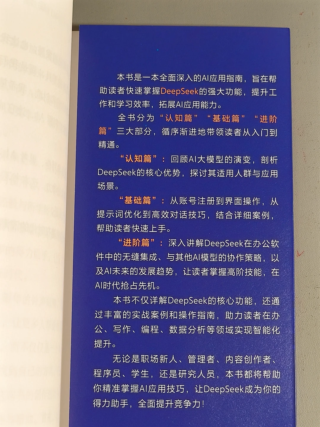 本书路线图:认知篇——基础篇——进阶篇。就算是AI小白也能玩转DeepSeek,在AI时代,解锁DeepSeek无'限可能,开启我们的“超级外挂”!