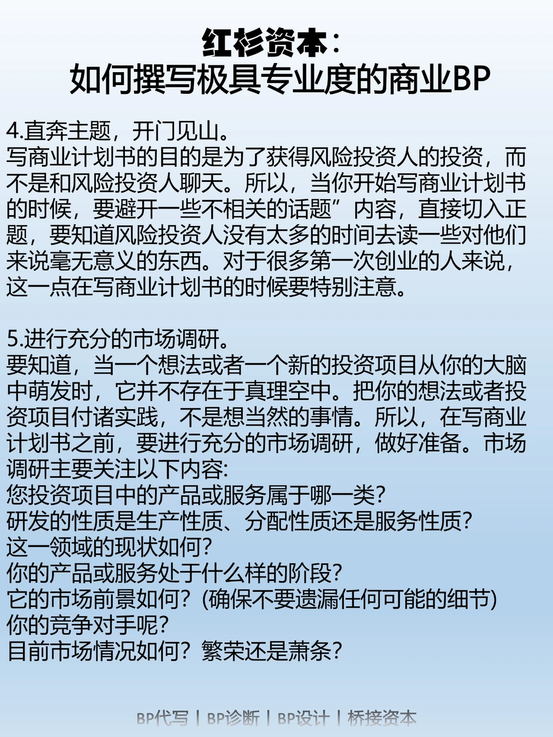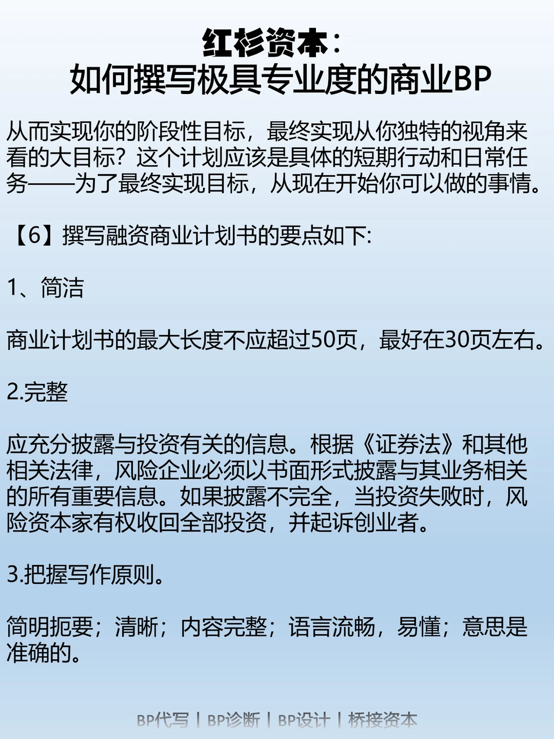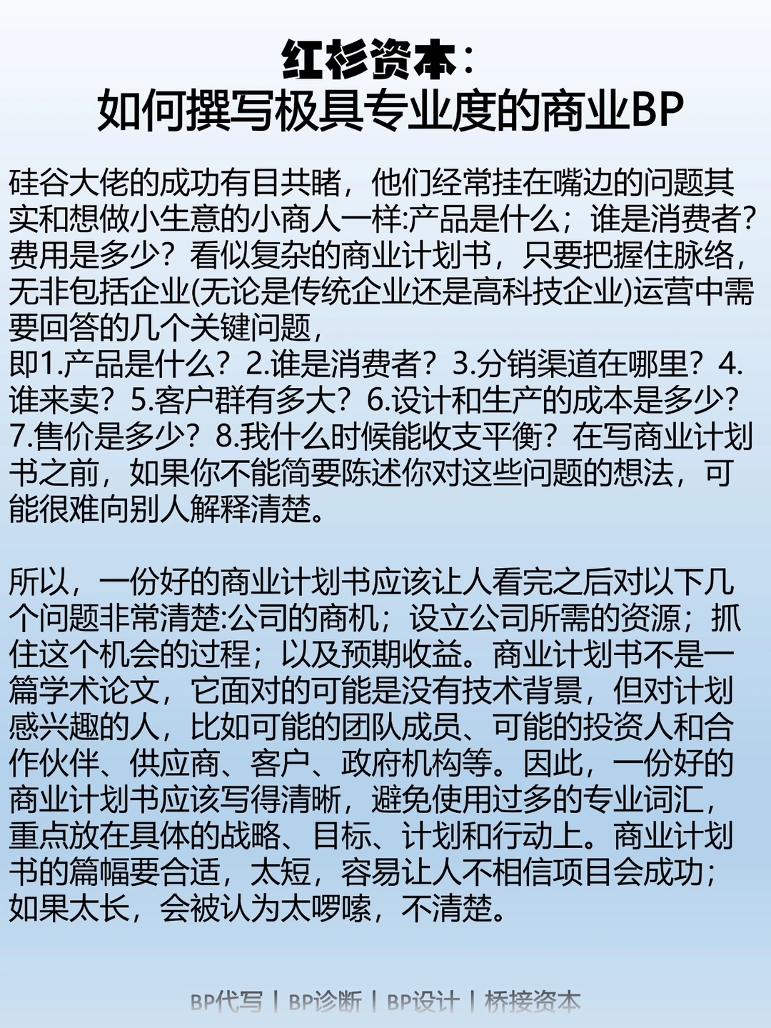 因此,一份出色的商业计划书应该让读者在阅读后清楚了解以下几个问题:市场机会;所需的资源;利用这一机会的计划;以及预期的盈利情况。商业计划书不同于学术论文,它的受众可能没有技术背景,但对商业计划感兴趣,比如潜在团队成员、潜在投资人、合作伙伴、供应商、客户、政府机构等。因此,一份出色的商业计划书应该表达清晰,避免使用过多专业术语,侧重于具体的战略、目标、计划和行动。商业计划书的长度应该适中,太短容易让人怀疑项目的成功性;太长则会被认为啰嗦不清晰