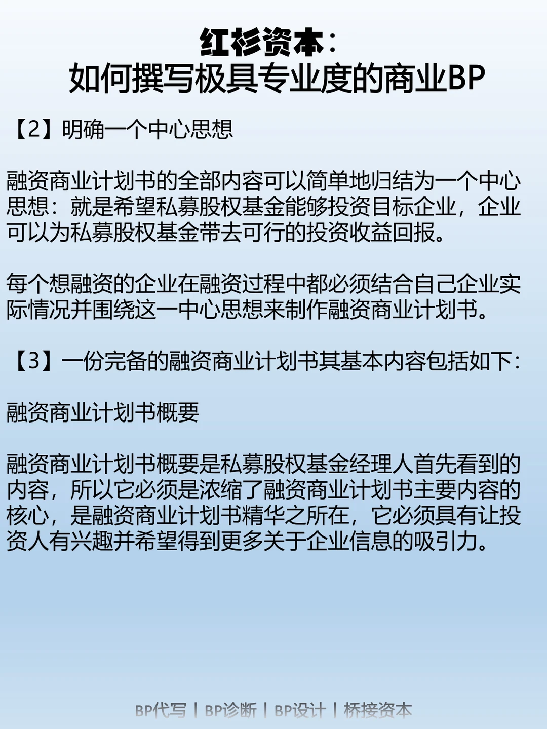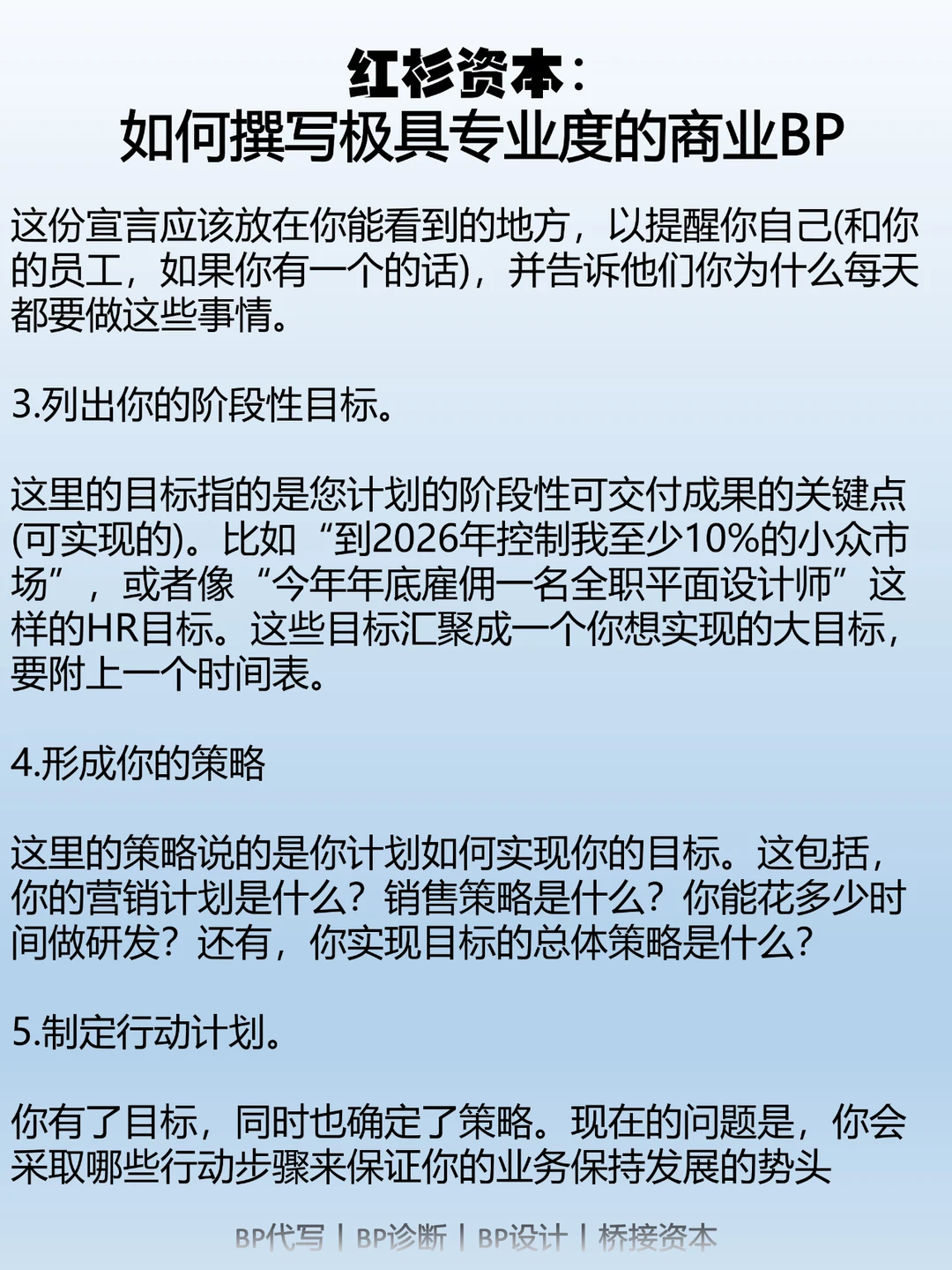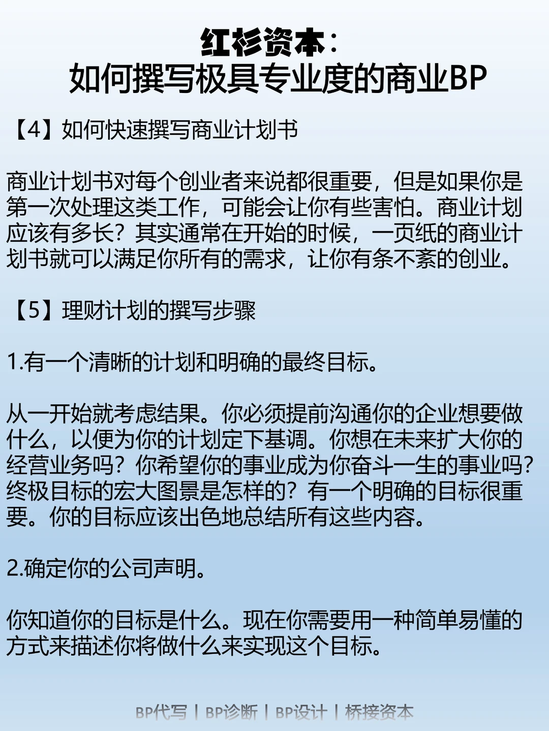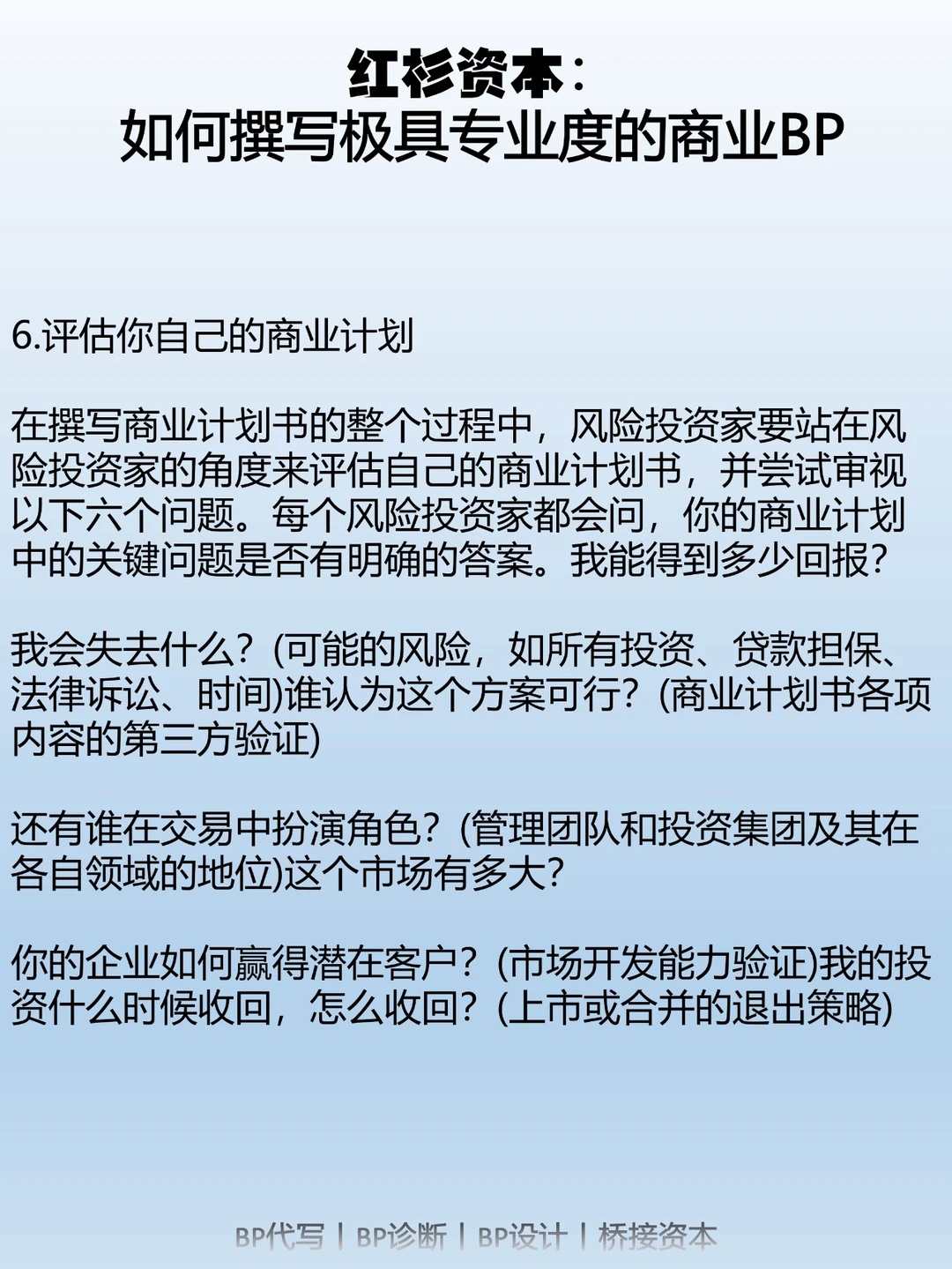 因此,一份出色的商业计划书应该让读者在阅读后清楚了解以下几个问题:市场机会;所需的资源;利用这一机会的计划;以及预期的盈利情况。商业计划书不同于学术论文,它的受众可能没有技术背景,但对商业计划感兴趣,比如潜在团队成员、潜在投资人、合作伙伴、供应商、客户、政府机构等。因此,一份出色的商业计划书应该表达清晰,避免使用过多专业术语,侧重于具体的战略、目标、计划和行动。商业计划书的长度应该适中,太短容易让人怀疑项目的成功性;太长则会被认为啰嗦不清晰