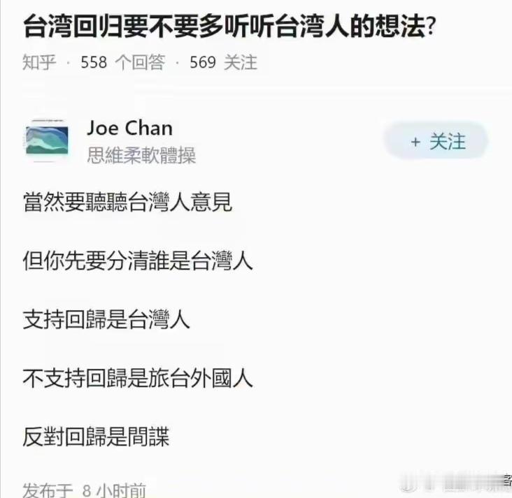 台湾回归要不要看台湾人的意见?当然要看!我觉得这位网友说得好,首先还是要对台湾的人进行甄别。 支持回归的肯定就是台湾人了。 不支持的肯定就是在台湾的外国人。 反对的肯定就是间谍。 在台湾的外国人,不支持统一,那就驱逐限期离开台湾。 间谍嘛,抓起来该枪毙枪毙,该坐牢坐牢。 图一这类货色肯定就是日本人在台湾的后裔,赶到日本去就行了。要是日本不接收,那就装船,让他们顺着洋流去南太平洋找他们的长毛象祖先。 点右上角关注我,我们一起去看这个魔幻的世界