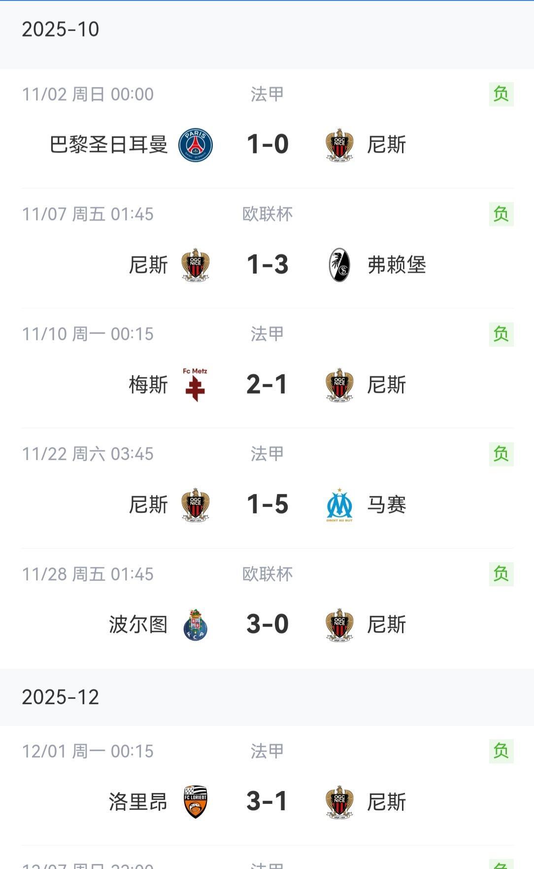 八连败、创队史记录 欧联杯第六轮战罢,来自法甲的尼斯在主场0-1不敌布拉加遭遇六连败,排名倒数第一,近期更是遭遇一波八连败,创造队史最长连败记录! 11月份之前的尼斯,虽说战绩也不咋地,但起码还能看,法甲3-2赢过里昂、2-0战胜里尔、2-2逼平过摩纳哥,但自从进入11月份被大巴黎读秒绝杀之后,尼斯仿佛进入了一个轮回,欧联杯1-3弗莱堡、0-3波尔图、0-1布拉加,联赛1-2梅斯、1-5马赛、1-3洛里昂、0-1昂热,两个月各项赛事八场全败! 尼斯在欧战已经遭遇了八连败,追平了此前马赛创造的法甲球队欧战连败记录,同时欧联杯18场不胜也追平了卢多戈雷茨创造的欧联杯最长不胜记录! 本月尼斯还有两场比赛,联赛客场对阵目前法甲排名第一的朗斯,法国杯主场迎战圣埃蒂安!