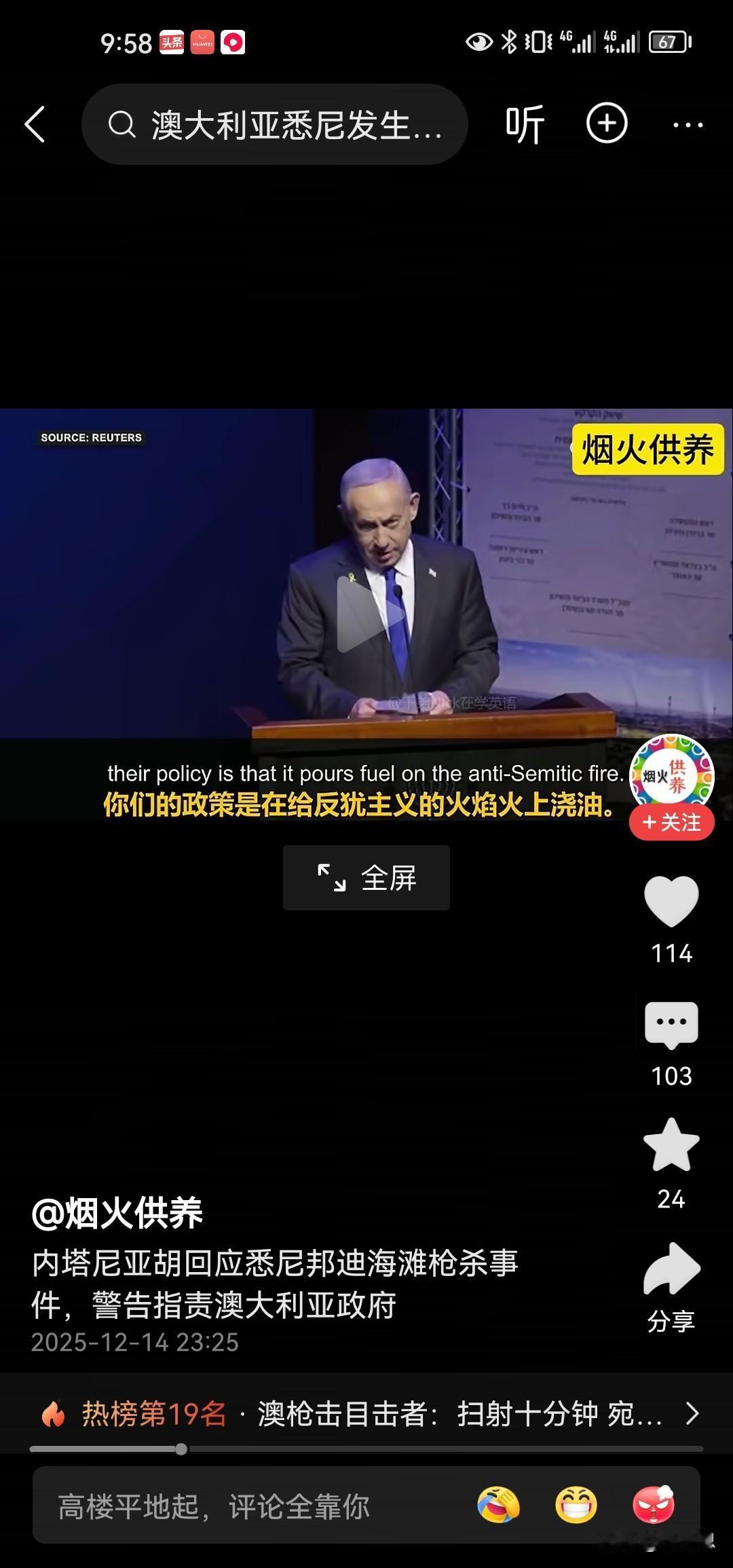 内塔尼亚胡公然干涉澳大利亚的内政啊。昨天澳大利亚发生了枪杀案,听说是针对犹太社区的,最近深陷各种舆论非议的内塔尼亚胡抓住了这根救火的稻草线啊,故意放大指责澳大利亚保护犹太不力,妥妥双标 一边要求全世界要优待犹太人 一边纵容以色列军人屠杀巴勒斯坦平民。以色列还真把看成是世界犹太人的老板了。别的国家犹太人跟以色列没什么关系,没有毛关系。他们又不是以色列的国民,犹太人并不等于以色列人,内塔既当又立有什么资格指责别人。