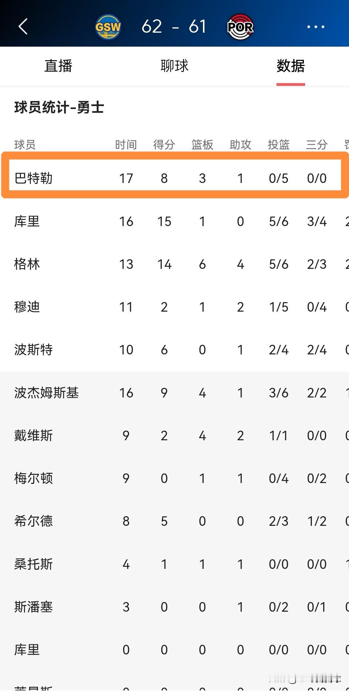 勇士超级巨星巴特勒真是太低迷了!在今天勇士客场挑战开拓者的比赛中,目前双方半场战罢,勇士以62:61领先对手1分。值得一提的是,在前两节比赛中,巴特勒首发出战17分钟,投篮5中0,仅仅依靠罚球得到8分,他的场上正负值为-2。 实事求是的说,在巴特勒的职业生涯中,像今天这么低迷的巴特勒真的很少见,他在上半场比赛中真是迷失了自己。