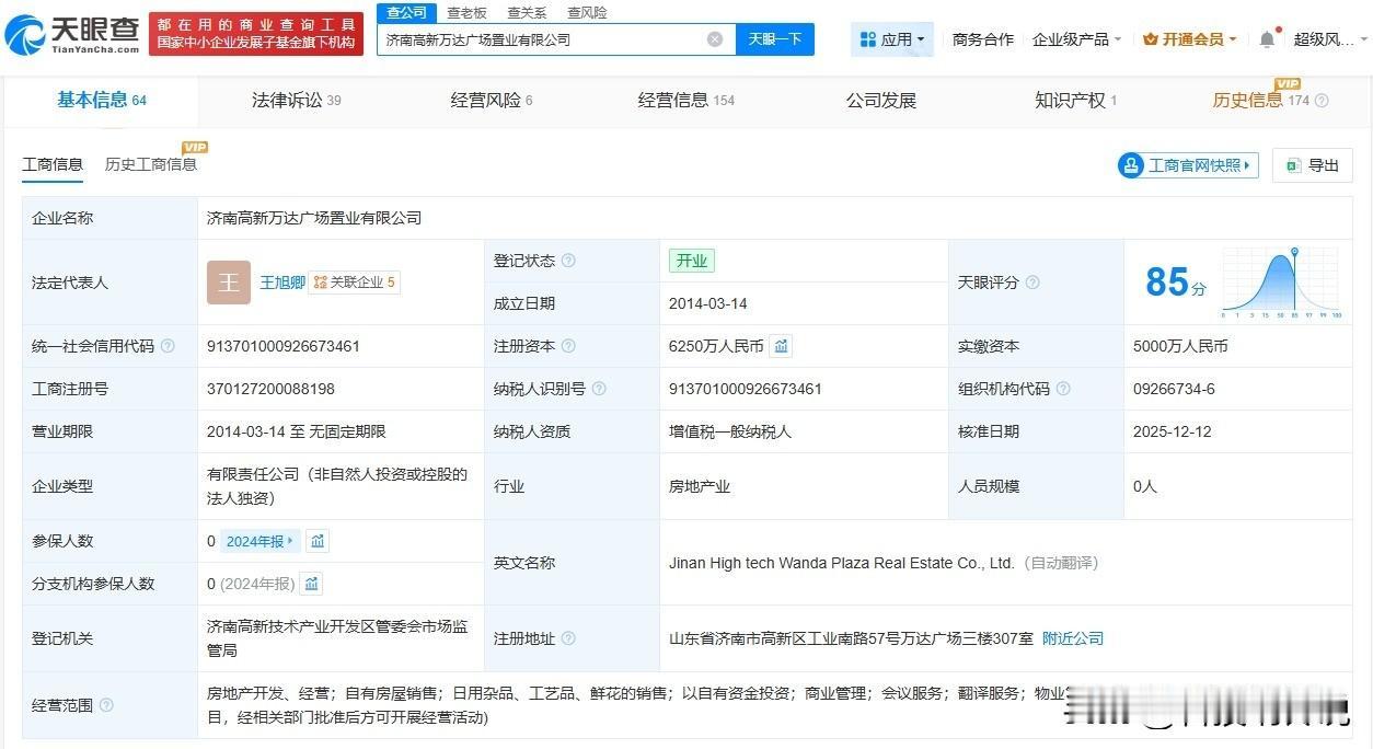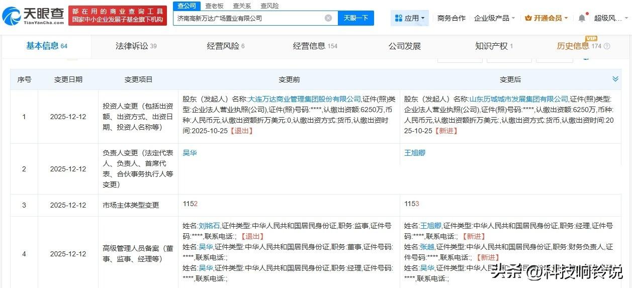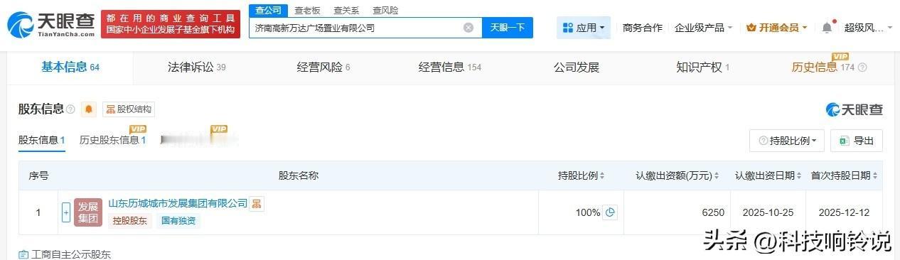 【万达转让济南高新万达广场置业公司 历城城发集团接盘】 天眼查工商信息显示,近日,济南高新万达广场置业有限公司发生工商变更,大连万达商业管理集团股份有限公司退出股东行列,新增山东历城城市发展集团有限公司全资持股,同时该公司法定代表人及高管均发生变更。 济南高新万达广场置业有限公司成立于2014年3月,注册资本6250万人民币,经营范围包括房地产开发、经营,自有房屋销售,以自有资金投资等。 天眼查信息: