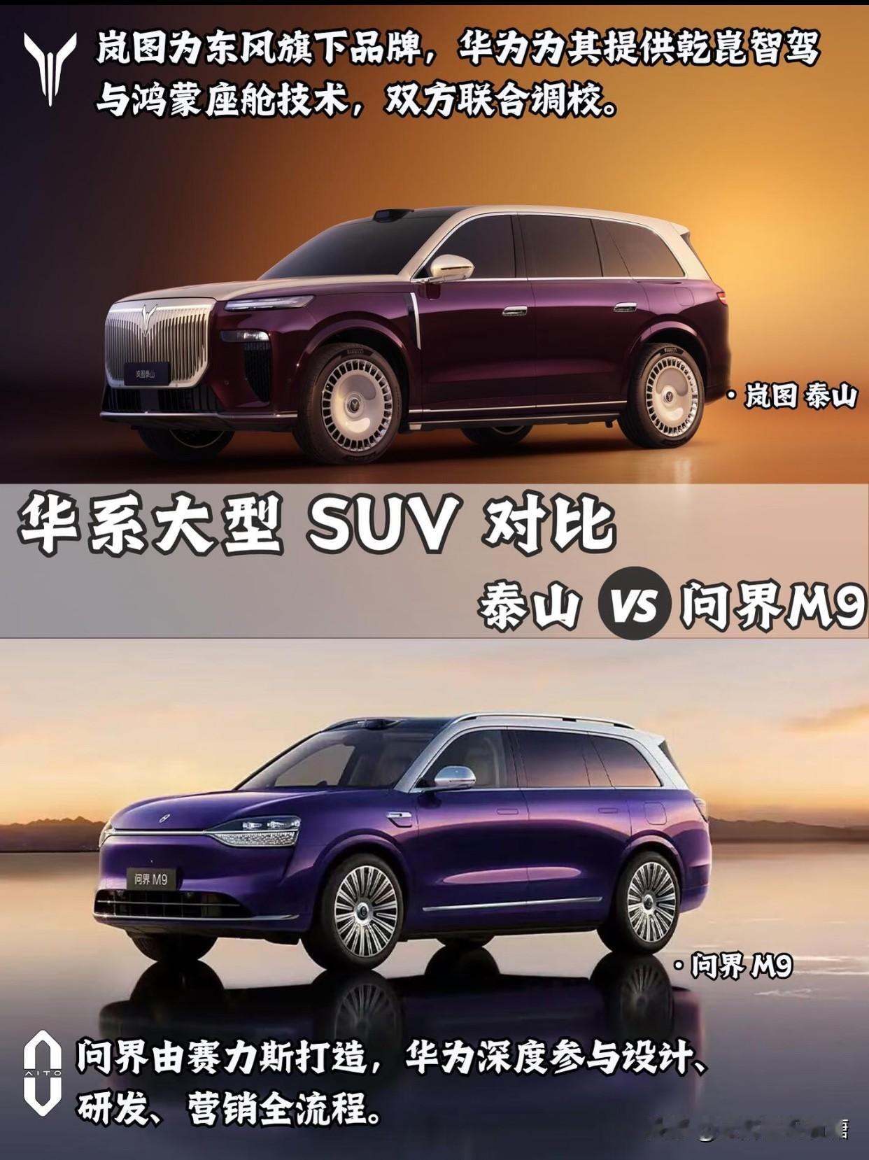 陪姑姐看大型SUV,试驾了岚图泰山和问界M9,现在正纠结选哪款。两款车都属华为系,风格却大有不同——泰山沉稳厚重,充满中式美学;M9则走极简科技路线。若你也在对比,不妨看看以下几点深度分析。 智驾系统 两车均搭载华为乾崑智驾ADS 4 Ultra,实际路况应对从容,能显著缓解驾驶疲劳。泰山预计配备500线四激光雷达,硬件冗余更强,后期升级潜力或许更大。 智能座舱 泰山首搭鸿蒙座舱5,语音大模型支持多轮自然对话,副驾虽无固定大屏,但预留扩展接口,可实现多屏联动。M9目前采用鸿蒙4,跨设备互联与多任务已很成熟,后续也可升级新版本,持续获得功能优化。 性能与舒适 泰山采用800V岚海超混系统,65度电池CLTC纯电续航370km,通勤基本可纯电应对,且搭载三腔空悬+EDC魔毯,滤震细腻,属豪车级配置。M9增程版配备52度电池,纯电续航290km,搭配单腔空悬与魔毯功能,城市与长途舒适性依然有保障。 怎么选? 若你偏爱中式气韵、注重纯电续航与底盘高阶配置,泰山更符合需求;若倾向于科技简约风,且信赖问界已有市场口碑,M9仍是稳妥之选。两款都是国产高端SUV的优秀代表,最终不妨带着家人亲身试驾,感受哪台更贴合日常场景与审美偏好。