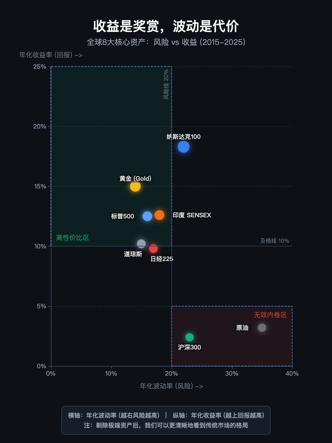 右下角 (辛苦区间):沪深300、原油。 这一块比较难受。 比如沪深300,它的波动率其实比美股还大,接近纳斯达克,但收益率却垫底。这就相当于“操着卖白粉的心,赚着卖白菜的钱”,属于比较辛苦的赛道。