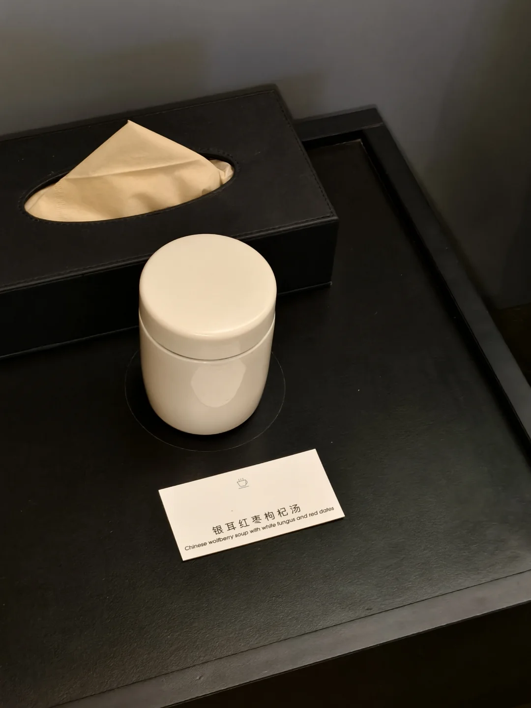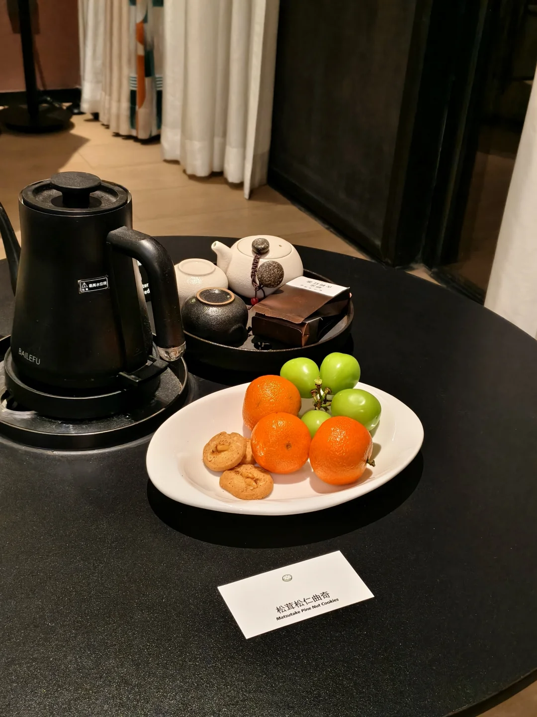 进入房间就看到欢迎水果和松茸曲奇,还有床边保温杯装着银耳汤,喝的时候还是暖暖的,感受到了服务的满满心意。
