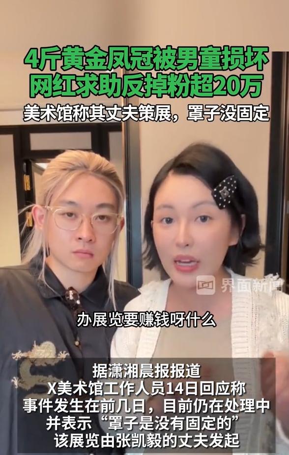 4斤黄金凤冠被男童损坏,网红求助反掉粉超20万,美术馆称其丈夫策展,罩子没固定[尬笑] 一件承载婚姻信物的手工黄金凤冠,在一次免费展览中被损坏,这件事最近在网上讨论得很热。争议的焦点很明确:责任在谁?是监护不力的家长,还是防护不足的展览方? 张凯毅的丈夫在结婚时亲手为她打造了这顶重约四斤的黄金凤冠,在由她丈夫发起的免费艺术展览上,一名男童在触碰展柜时,凤冠连同保护罩一起摔落受损。张凯毅在视频中强调,这件物品对她而言情感价值远超经济价值,是独一无二的纪念。 根据网络流传的信息,涉事美术馆方面有回应称“罩子是没有固定的”。如果这一说法属实,那么展览的基础安全防护措施就值得商榷。展览虽为免费,但并不能免除组织者对贵重展品提供基本安全保护的责任。 关于大家最关心的损失问题,情况比较复杂。视频显示凤冠确有损坏。由于其纯手工制作且工艺复杂,有法律专业人士指出,此类物品的修复费用甚至可能超过黄金本身价值,且情感价值的折损更是无法用金钱弥补。 网络流传的“工费定损数十万”的说法,并未得到权威鉴定机构或当事人的正式确认,需谨慎看待。普遍的法律原则是,未成年人造成他人财产损害,应由其监护人承担民事赔偿责任。 张凯毅本人表示,她并未向孩子家庭索赔,因为展品已购买保险。她发布视频的初衷是咨询定损事宜,而非针对具体个人。事件发酵后,据观察她的社交账号粉丝数量出现波动,并关闭了私信评论功能,这反映了网络舆论场的复杂一面。 免费不等于免责,越是珍贵的展品,越需要匹配坚固的展柜、清晰的提醒和必要的现场管理。一个未固定的保护罩,可能就让所有的分享善意暴露在风险之下。 对于观众,特别是带孩子的家长,这也是一次提醒。公共场所的礼仪和规矩需要从小培养。展览馆不是游乐场,玻璃柜不是触摸屏,家长的视线和引导一刻也不能放松。孩子的无心之失,背后往往是成人监护责任的暂时缺席。 这件事最终会如何解决,尚待后续。但它给所有人都上了一课:分享艺术需要开放的胸怀,保护艺术需要严谨的细节,而欣赏艺术,则需要一颗敬畏与自律的心。无论展览收费与否,这份对创作者心血的尊重,和对公共规则的遵守,是所有美好体验的共同基础。 网友评论: “孩子确实伸手了,但哪个小孩不好奇?关键是那个保护罩,轻轻一碰就直接掉了,根本没固定住。”博物馆级别的展柜绝不会这么脆弱,这种安全措施对于贵重展品来说显然不合格。 “这要是碰上个大风天,或者有人不小心撞一下,展品是不是也得跟着遭殃?” 既然免费开放分享艺术是好事,但基本的保护必须到位,否则好心也可能办坏事。 “视频里看得很清楚,那孩子不止碰了一下,家长就在旁边,为什么没有及时制止?”看展不触摸是最基本的礼仪,家长有责任提前教育并看管好孩子。不能因为“孩子小”就认为没错,这次事件正是一个教育孩子“犯错需要承担后果”的机会。 这类事件的责任需要综合判断。如果保护罩确实未固定且现场警示不足,策展方可能需承担部分责任;而监护人的主要责任通常难以推卸。同时,大家也赞同博主不直接向孩子家庭索赔、而是通过保险处理的方式,认为这体现了气度,也让焦点回归到如何改进问题上。 这场意外像一面镜子,照出了公共文化活动中我们共同面临的问题:一方面,展览组织者必须把安全做到极致,特别是对承载着特殊情感和价值的物品;另一方面,我们每个人在享受公共文化资源时,也要时刻绷紧“文明观展”这根弦,特别是带孩子的家长,身教重于言传。 假如你是这位博主,在处理这件事时,你最看重的是修复凤冠、厘清赔偿责任,还是更想借此机会推动大家重视观展礼仪?如果你是展览的组织者,你会采取哪些具体措施来防止类似事件发生?欢迎在评论区分享你的真实想法! 信源:界面新闻
