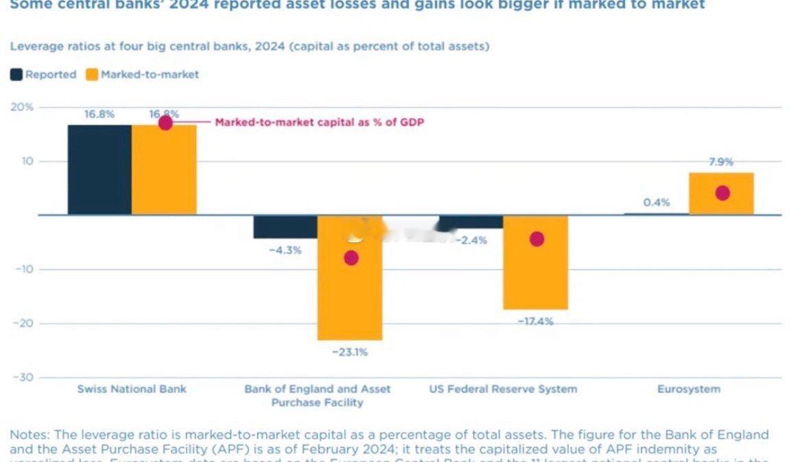 彼得森国际经济研究所发布的一份研究报告指出,由于会计准则存在差异,全球主要央行的真实财务状况难以进行直接比较。该报告作者、爱尔兰央行前行长Patrick Honohan举例称,若美联储采用与瑞士央行相同的会计方法,美联储的资产损失将远大于其报告的数字,其2024年底的净资产将为负值,相当于GDP的4%以上。报告认为,这些看似无害的会计差异,掩盖了货币政策选择背后的真实财务影响。