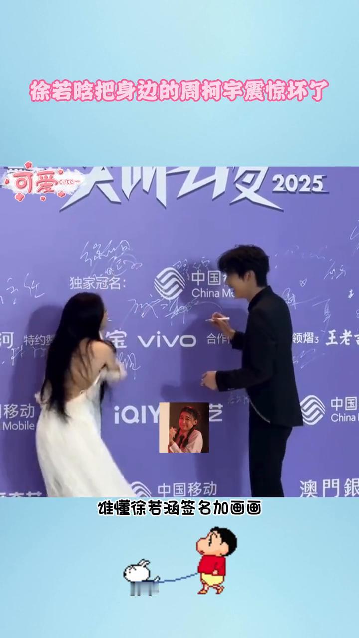 徐若晗把身边的周柯宇震惊坏了。 我的天,徐若涵签名真是内娱独一份。看这个徐若涵,快把身边的周柯宇震惊坏了。谁懂徐若涵签名加画画只用了5.4秒就完成了,堪比美术生画速写。这个熟练程度我还以为开了倍速,后面把笔递给工作人员也是双手奉上,真的很有礼貌,难怪大家都这么喜欢她。