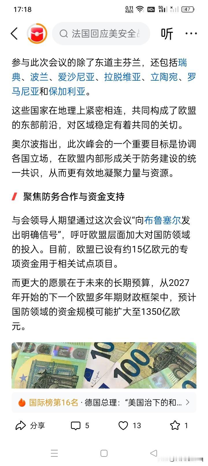 找与自己差不多的! 欧洲东部的国家芬兰、瑞典、波兰、爱沙尼亚、拉脱维亚、立陶宛、罗马尼亚和保加利亚八个国家的领导人,将于12月16日计划在芬兰首都赫尔辛基举行会议,讨论和磋商他们国家安全和防御的问题和事务。 面对这场最初似乎是突如其来的乌克兰战争,无疑让这些欧洲东部的国家对安全和防御的问题格外敏感和担忧。有人称这八个国家为小北约,实在说来,由于美国对北约似乎表示出来的三心二意,如果说他们是在大北约之中,好像可能成立一个更加团结,军事合作和安全保障合作更加紧密的小北约,估计也很有可能。 唯一遗憾的是,这次在赫尔辛基举行的会议没有乌克兰参加,因为乌克兰目前的军事力量,很可能在欧洲东部占举足轻重的地位。不过,乌克兰目前处于激烈的战争中,以及各方正在角力的和平协议草案之中,或许不方便参加这次会议。