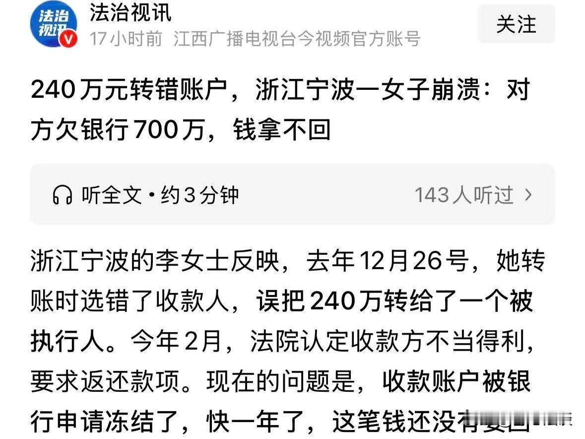 一念之差!浙江杭州,女子误将240万巨款转错她人,发现的那一刻她立即报警,并将对方提起诉讼,同时申请了财产保户,万万没想到,法院冻结对方的账户后,竟然发现对方早已因欠了银行700万贷款逾期未还,账户早就被另一家法院现行冻结,而女子转错的240万也已经被自动划走了一部分,现在仅剩下183万,最主要是这钱还取不出来,因为前面排着多家法院的查封,也就意味着,这钱能不能拿回来还说不定,这让女子束手无措! 李女士因粗心大意误将240万转错了人,导致她现在生活彻底乱了套。 一年来跑断了腿、操碎了心,到最后还是两眼一抹黑,不知道这笔钱到底能不能拿回来。 这事还要从去年12月26号说起,李女士正忙着帮闺蜜处理一笔还款的事。 原来闺蜜杜某此前欠了刘女士305万,还款日临近却只凑到65万,无奈之下向李女士求助。 李女士念及多年情谊,爽快拿出240万帮助闺蜜。 但两人商量好,先把钱转给共同好友甲莹,再由甲莹转交给刘女士,这样也能保证资金安全。 可当时两人通着电话,李女士一时分心,在输入收款人信息的时候,没仔细核对名字和账号。 本来要转给单名一个“莹”字的甲女士,结果手一滑,点到了另一个也叫“莹”、只是姓氏不同的乙女士账户上。 而李女士也认识这个乙莹,当时没注意转错了,三笔转账接连操作,直接将240万全部转过去。 可甲女士那边说压根没收到钱的时候,李女士查看转账信息的时候瞬间出了一身冷汗。 她第一反应就是报警,紧接着又火急火燎地联系银行,想赶紧把对方的账户冻结,把钱追回来。 然后电话联系乙莹,没想到,乙女士的号码要么没人接,要么就是无法接通,到最后干脆直接停机了。 果不其然,等她赶到法院,提起诉讼要求乙女士返还这笔不当得利,同时申请财产保全的时候,一个让她心凉半截的消息砸了过来: 乙莹的账户,早在2023年5月13日就被冻结了。 原来这位乙莹之前在银行贷了700万的贷款,到期后迟迟不还,银行早就把她告上了法庭。 法院受理案件的同时,就对她的账户采取了冻结保全措施。 今年2月,法院的判决书下来了,明确认定乙莹构成不当得利,要求返还李女士240万元。 拿到判决书的那一刻,李女士激动得差点哭出来,觉得自己的辛苦奔波总算有了盼头。 可她万万没想到,这只是另一个噩梦的开始。 拿着胜诉判决书申请执行时,李女士被告知,2月13日,首封法院已从乙莹账户划走两笔钱。 306200元和567800元,用于偿还乙莹的其他债务,与那笔700万银行贷款毫无关系,让原本的240万,就此只剩183万。 李女士想不通,明明自己第一时间就冻结报警了,怎么还能动用这笔钱呢。 但事已至此,183万虽然比240万少了一大截,但好歹也能要回来一笔,只要能把这部分拿回来,也算是减少点损失。 可接下来法院的话,直接把她打入了万丈深渊。 原来乙莹在外欠的债不止一笔,她的这个账户上,还排着多家法院的轮候查封。 李女士的保全申请,只能乖乖排在队伍的最后面。 更让她崩溃的是,11月11日,法院直接驳回了她的执行异议申请,给出的理由是,她的权利无法对抗本案的强制执行。 这句话像一把重锤,狠狠砸在李女士的心上。她想不通,明明法院都判了钱是自己的,怎么到了执行环节,就这么难? 无奈之下,李女士只能继续维权,提起了异议之诉。 这一年来,李女士跑遍了法院和银行,每天不是在递交材料,就是在去递交材料的路上。 如今的李女士,就像掉进了一个巨大的迷宫,四面八方都是墙,看不到一点光亮。 账户里的183万还被冻结着,前面还有多家法院的查封在排队。 她不知道自己的异议之诉什么时候才能开庭,更不知道这笔钱到底能不能回到自己手上。  《民法典》第985条:得利人没有法律根据取得不当利益的,受损失的人可以请求其返还取得的利益。 李女士误转240万,乙莹无任何合法理由收款,完全符合“一方获益、一方受损、获益无依据、二者有因果”的不当得利四要件,法院据此判乙莹返还,法理上无争议。 《民事诉讼法》第103条:对于可能因当事人一方的行为或者其他原因,使判决难以执行或者造成当事人其他损害的案件。 根据对方当事人的申请,可以裁定对其财产进行保全、责令其作出一定行为或者禁止其作出一定行为; 当事人没有提出申请的,人民法院在必要时也可以裁定采取保全措施。 2023年5月银行起诉时,法院已对乙莹账户首封。 李女士在12月申请的保全只能是轮候查封,效力排在首封之后。 首封法院有权先划扣账户资金偿债,这是李女士款项被划走的关键原因。 说到底,警醒所有人,转账时务必仔细核对姓名、账号、开户行三要素,哪怕是熟人、哪怕时间再急,都不能掉以轻心。 毕竟,比起事后耗费大量精力维权,事前多一份细心,才能真正守住自己的血汗钱。 对此,您怎么看这件事?