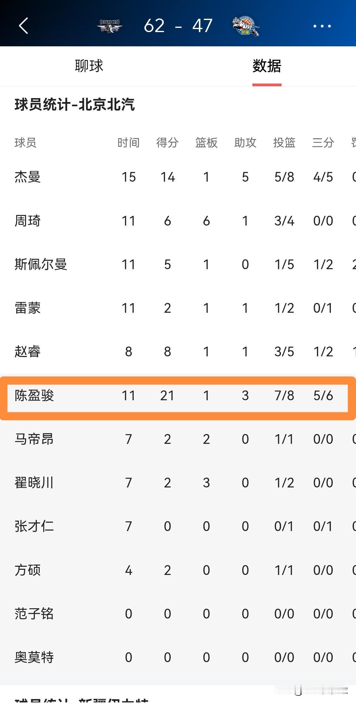 北京北汽球星陈盈骏真是完全杀疯了!在今天进行的北京北汽和新疆伊犁特的上半场比赛中,陈盈骏替补出战11分钟,投篮8中7,其中三分球6中5、罚球2中2爆砍21分,他的场上正负值为+16,带领球队以62:47领先对手结束了前两节的比赛。 坦白说,虽然本场比赛球星云集,但是陈盈骏绝对是场上最闪耀的球星。