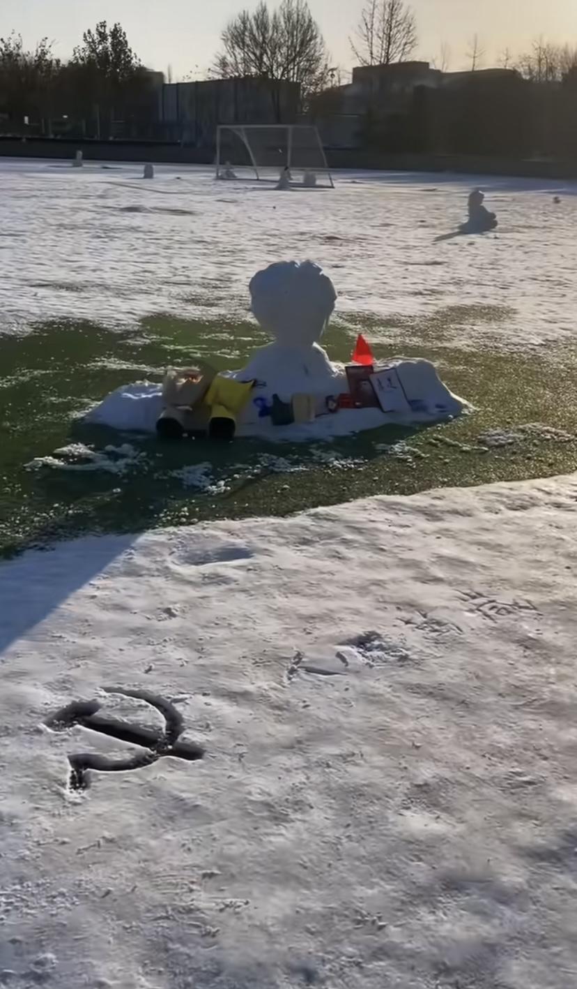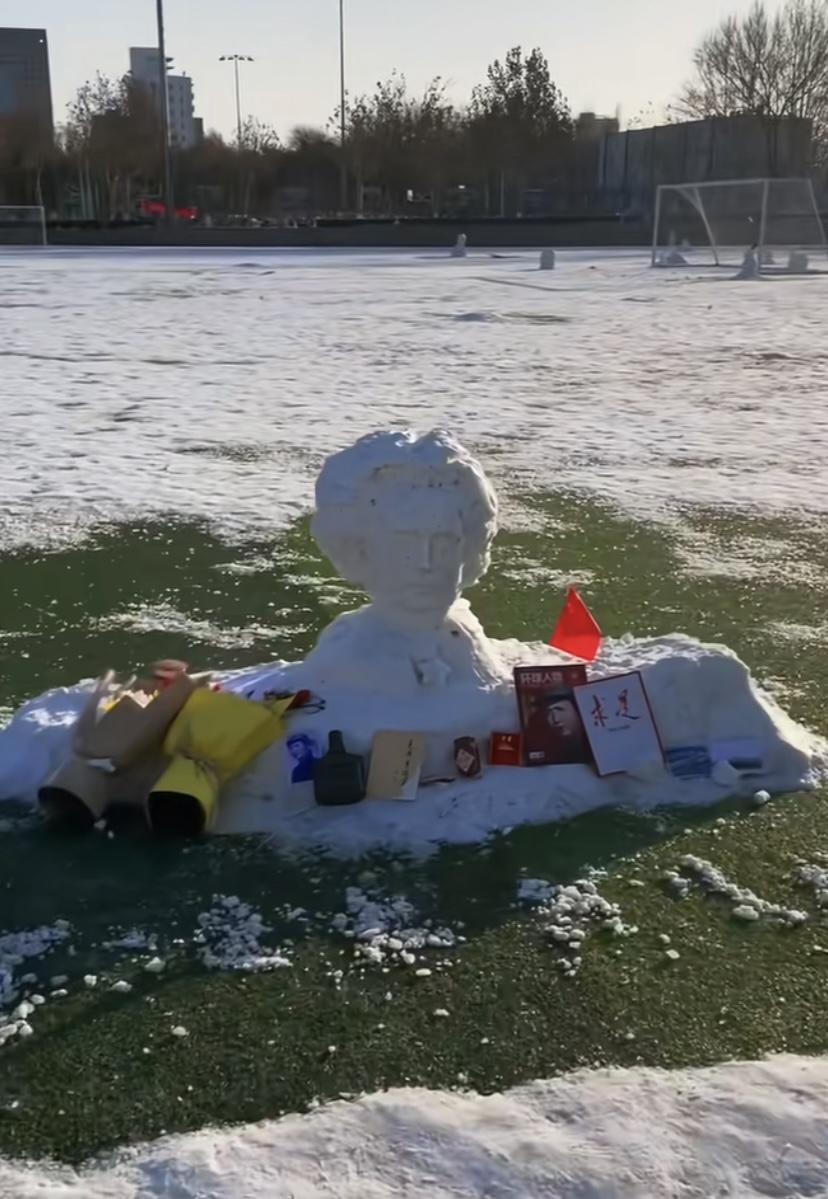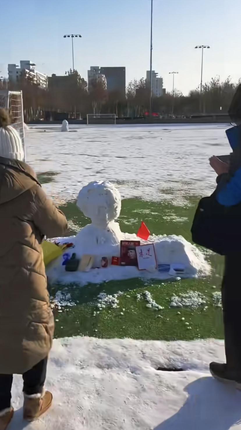民间有人才啊!在操场上做了一个雪人,路过的人们送上礼品、书与花,还在雪地上刻了字!