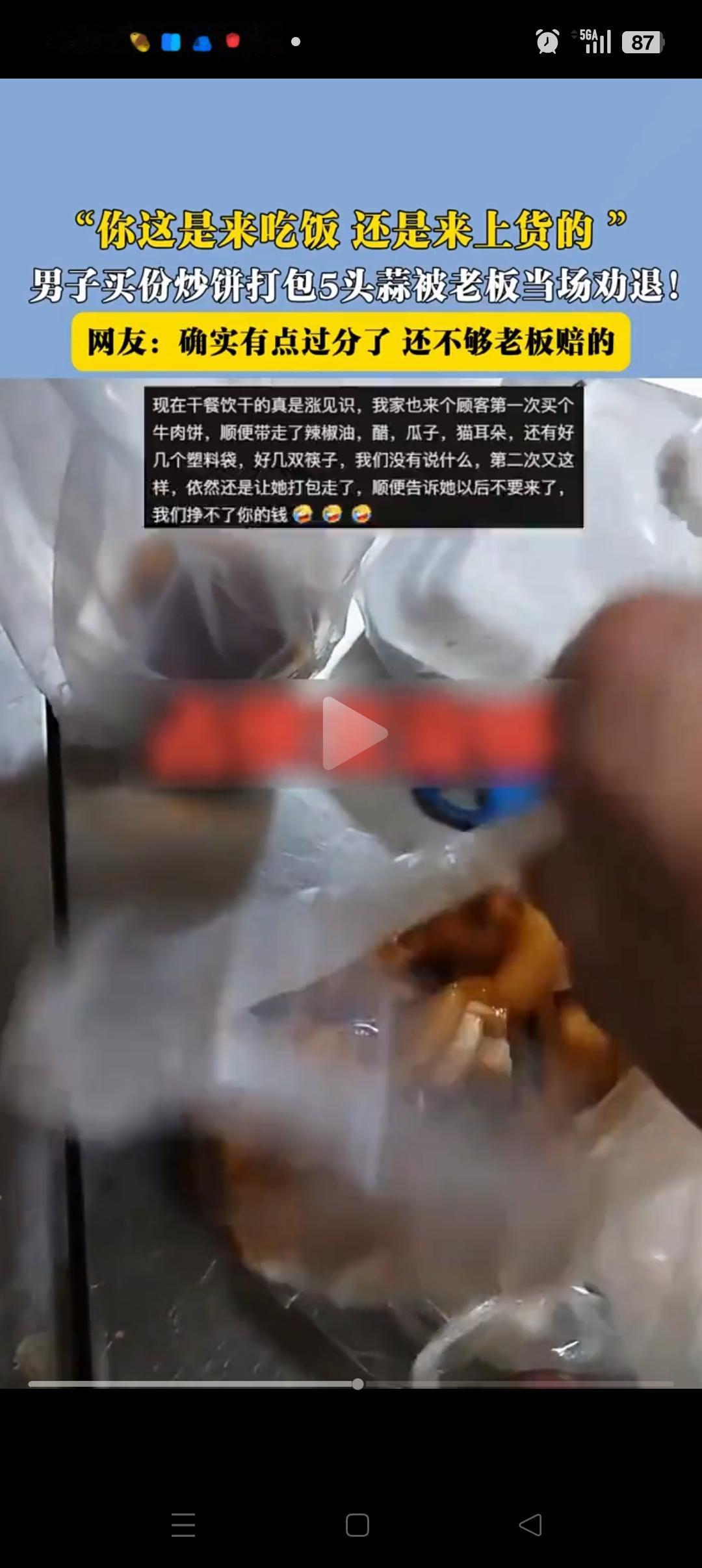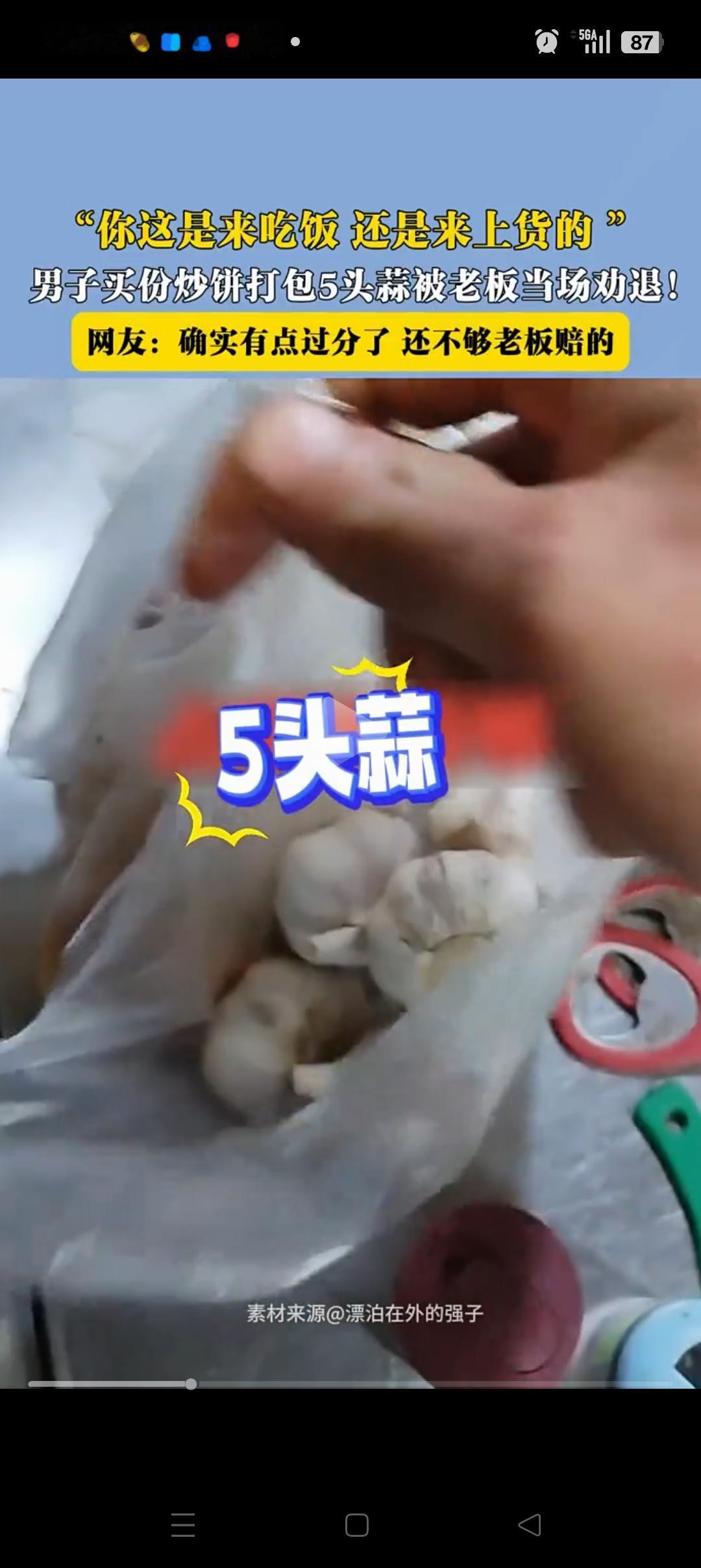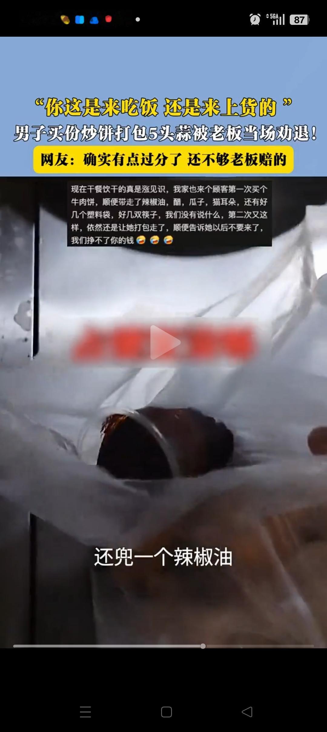 “这是来进货的吧?[笑哭]”,天津,一小伙买了份炒饼,却打包了5头蒜,一份咸菜,还有一杯辣椒油。老板气的不行,说:走吧,走吧,我不卖你了。网友们也笑了:你是来吃饭的,还是进货的? 有的网友说:老板的格局小了!不是每个人都这样,只是偶尔的,亏不了。这么说就有点过了!5头蒜差不多也要8块钱了,加上炒饼的成本,这一单怕是亏本。老板做生意也不容易,赚的少一点可以,但也不能亏本吧。 也有网友说:让他现场吃,吃多少都认了!但是打包是不行的,必须给他上一课。 小伙子这贪便宜的心里得改啊,要不然以后走到哪里都没人喜欢,贪小便宜吃大亏啊。。